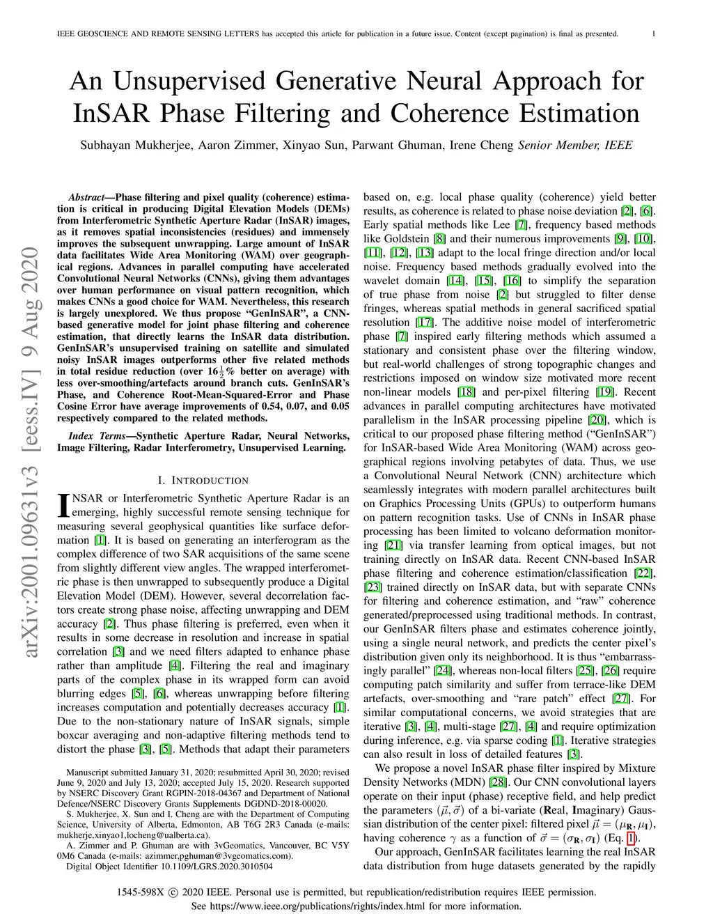 Phase filtering and pixel quality (coherence) estimation is critical in producing Digital Elevation Models (DEMs) from Interferometric Synthetic Aperture Radar (InSAR) images, as it removes spatial inconsistencies (residues) and immensely improves the subsequent unwrapping. Large amount of InSAR data facilitates Wide Area Monitoring (WAM) over geographical regions. Advances in parallel computing have accelerated Convolutional Neural Networks (CNNs), giving them advantages over human performance on visual pattern recognition, which makes CNNs a good choice for WAM. Nevertheless, this research is largely unexplored. We thus propose "GenInSAR", a CNN-based generative model for joint phase filtering and coherence estimation, that directly learns the InSAR data distribution. GenInSAR's unsupervised training on satellite and simulated noisy InSAR images outperforms other five related methods in total residue reduction (over 16.5% better on average) with less over-smoothing/artefacts around branch cuts. GenInSAR's Phase, and Coherence Root-Mean-Squared-Error and Phase Cosine Error have average improvements of 0.54, 0.07, and 0.05 respectively compared to the related methods.