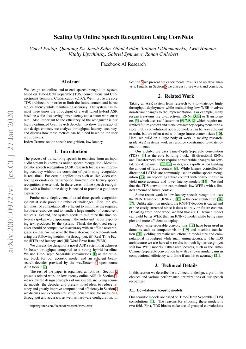 We design an online end-to-end speech recognition system based on Time-Depth Separable (TDS) convolutions and Connectionist Temporal Classification (CTC). We improve the core TDS architecture in order to limit the future context and hence reduce latency while maintaining accuracy. The system has almost three times the throughput of a well tuned hybrid ASR baseline while also having lower latency and a better word error rate. Also important to the efficiency of the recognizer is our highly optimized beam search decoder. To show the impact of our design choices, we analyze throughput, latency, accuracy, and discuss how these metrics can be tuned based on the user requirements.
