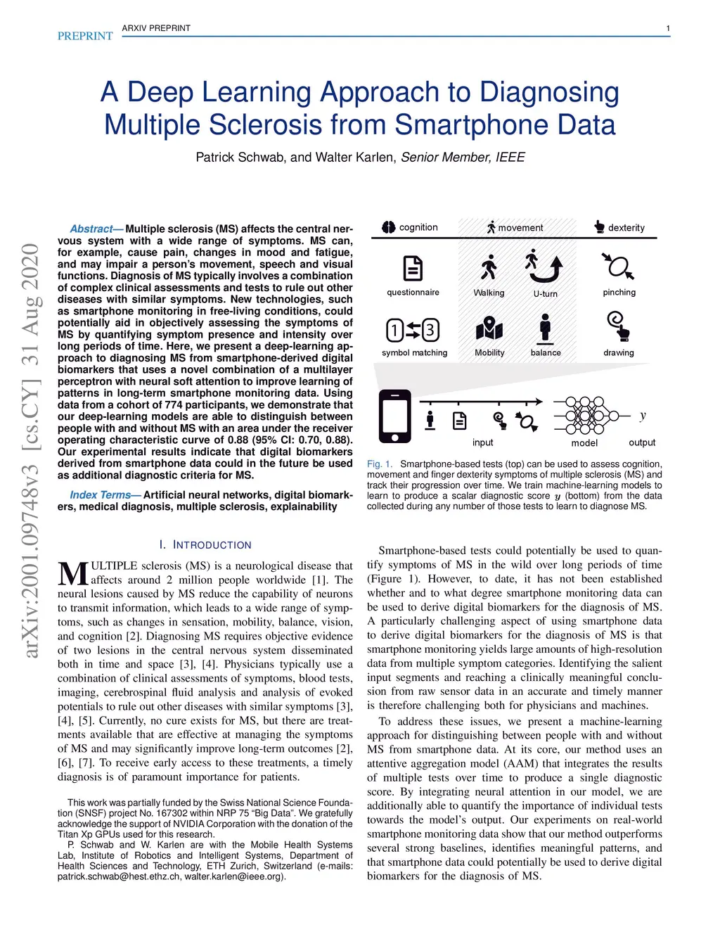 Multiple sclerosis (MS) affects the central nervous system with a wide range of symptoms. MS can, for example, cause pain, changes in mood and fatigue, and may impair a person's movement, speech and visual functions. Diagnosis of MS typically involves a combination of complex clinical assessments and tests to rule out other diseases with similar symptoms. New technologies, such as smartphone monitoring in free-living conditions, could potentially aid in objectively assessing the symptoms of MS by quantifying symptom presence and intensity over long periods of time. Here, we present a deep-learning approach to diagnosing MS from smartphone-derived digital biomarkers that uses a novel combination of a multilayer perceptron with neural soft attention to improve learning of patterns in long-term smartphone monitoring data. Using data from a cohort of 774 participants, we demonstrate that our deep-learning models are able to distinguish between people with and without MS with an area under the receiver operating characteristic curve of 0.88 (95% CI: 0.70, 0.88). Our experimental results indicate that digital biomarkers derived from smartphone data could in the future be used as additional diagnostic criteria for MS.