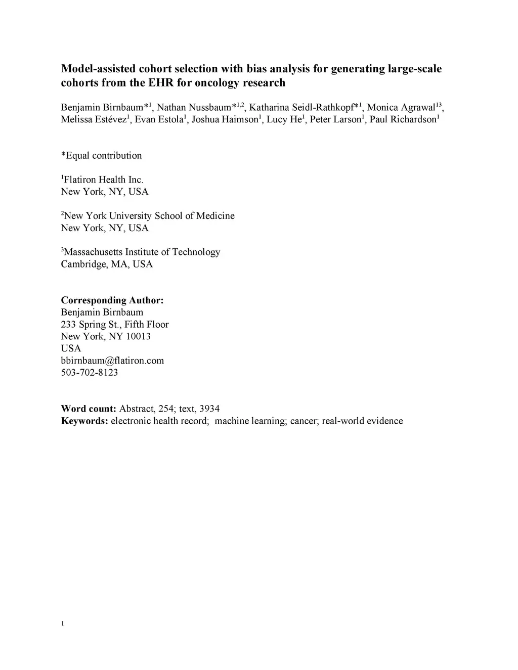 Objective Electronic health records (EHRs) are a promising source of data for health outcomes research in oncology. A challenge in using EHR data is that selecting cohorts of patients often requires information in unstructured parts of the record. Machine learning has been used to address this, but even high-performing algorithms may select patients in a non-random manner and bias the resulting cohort. To improve the efficiency of cohort selection while measuring potential bias, we introduce a technique called Model-Assisted Cohort Selection (MACS) with Bias Analysis and apply it to the selection of metastatic breast cancer (mBC) patients. Materials and Methods We trained a model on 17,263 patients using term-frequency inverse-document-frequency (TF-IDF) and logistic regression. We used a test set of 17,292 patients to measure algorithm performance and perform Bias Analysis. We compared the cohort generated by MACS to the cohort that would have been generated without MACS as reference standard, first by comparing distributions of an extensive set of clinical and demographic variables and then by comparing the results of two analyses addressing existing example research questions. Results Our algorithm had an area under the curve (AUC) of 0.976, a sensitivity of 96.0%, and an abstraction efficiency gain of 77.9%. During Bias Analysis, we found no large differences in baseline characteristics and no differences in the example analyses. Conclusion MACS with bias analysis can significantly improve the efficiency of cohort selection on EHR data while instilling confidence that outcomes research performed on the resulting cohort will not be biased.