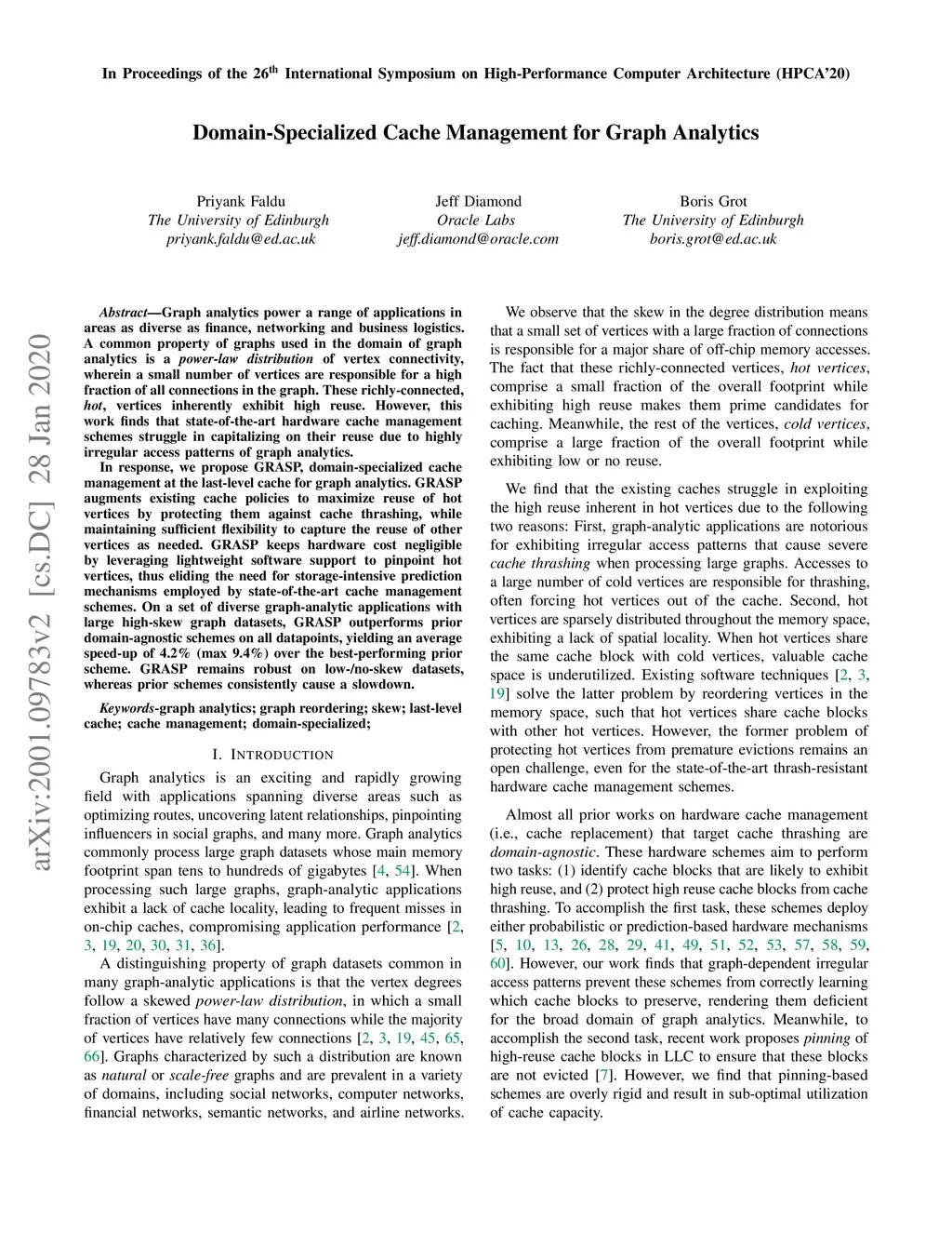 Graph analytics power a range of applications in areas as diverse as finance, networking and business logistics. A common property of graphs used in the domain of graph analytics is a power-law distribution of vertex connectivity, wherein a small number of vertices are responsible for a high fraction of all connections in the graph. These richly-connected, hot, vertices inherently exhibit high reuse. However, this work finds that state-of-the-art hardware cache management schemes struggle in capitalizing on their reuse due to highly irregular access patterns of graph analytics. In response, we propose GRASP, domain-specialized cache management at the last-level cache for graph analytics. GRASP augments existing cache policies to maximize reuse of hot vertices by protecting them against cache thrashing, while maintaining sufficient flexibility to capture the reuse of other vertices as needed. GRASP keeps hardware cost negligible by leveraging lightweight software support to pinpoint hot vertices, thus eliding the need for storage-intensive prediction mechanisms employed by state-of-the-art cache management schemes. On a set of diverse graph-analytic applications with large high-skew graph datasets, GRASP outperforms prior domain-agnostic schemes on all datapoints, yielding an average speed-up of 4.2% (max 9.4%) over the best-performing prior scheme. GRASP remains robust on low-/no-skew datasets, whereas prior schemes consistently cause a slowdown.