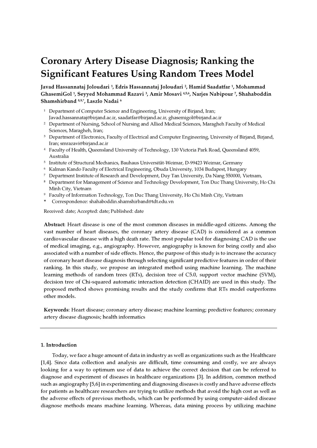 Heart disease is one of the most common diseases in middle-aged citizens. Among the vast number of heart diseases, the coronary artery disease (CAD) is considered as a common cardiovascular disease with a high death rate. The most popular tool for diagnosing CAD is the use of medical imaging, e.g., angiography. However, angiography is known for being costly and also associated with a number of side effects. Hence, the purpose of this study is to increase the accuracy of coronary heart disease diagnosis through selecting significant predictive features in order of their ranking. In this study, we propose an integrated method using machine learning. The machine learning methods of random trees (RTs), decision tree of C5.0, support vector machine (SVM), decision tree of Chi-squared automatic interaction detection (CHAID) are used in this study. The proposed method shows promising results and the study confirms that RTs model outperforms other models.