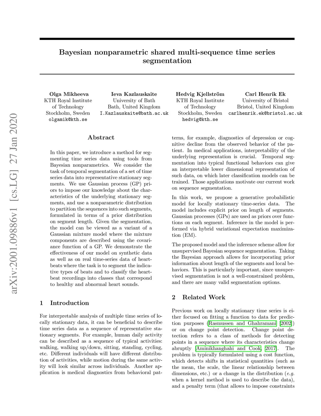 In this paper, we introduce a method for segmenting time series data using tools from Bayesian nonparametrics. We consider the task of temporal segmentation of a set of time series data into representative stationary segments. We use Gaussian process (GP) priors to impose our knowledge about the characteristics of the underlying stationary segments, and use a nonparametric distribution to partition the sequences into such segments, formulated in terms of a prior distribution on segment length. Given the segmentation, the model can be viewed as a variant of a Gaussian mixture model where the mixture components are described using the covariance function of a GP. We demonstrate the effectiveness of our model on synthetic data as well as on real time-series data of heartbeats where the task is to segment the indicative types of beats and to classify the heartbeat recordings into classes that correspond to healthy and abnormal heart sounds.