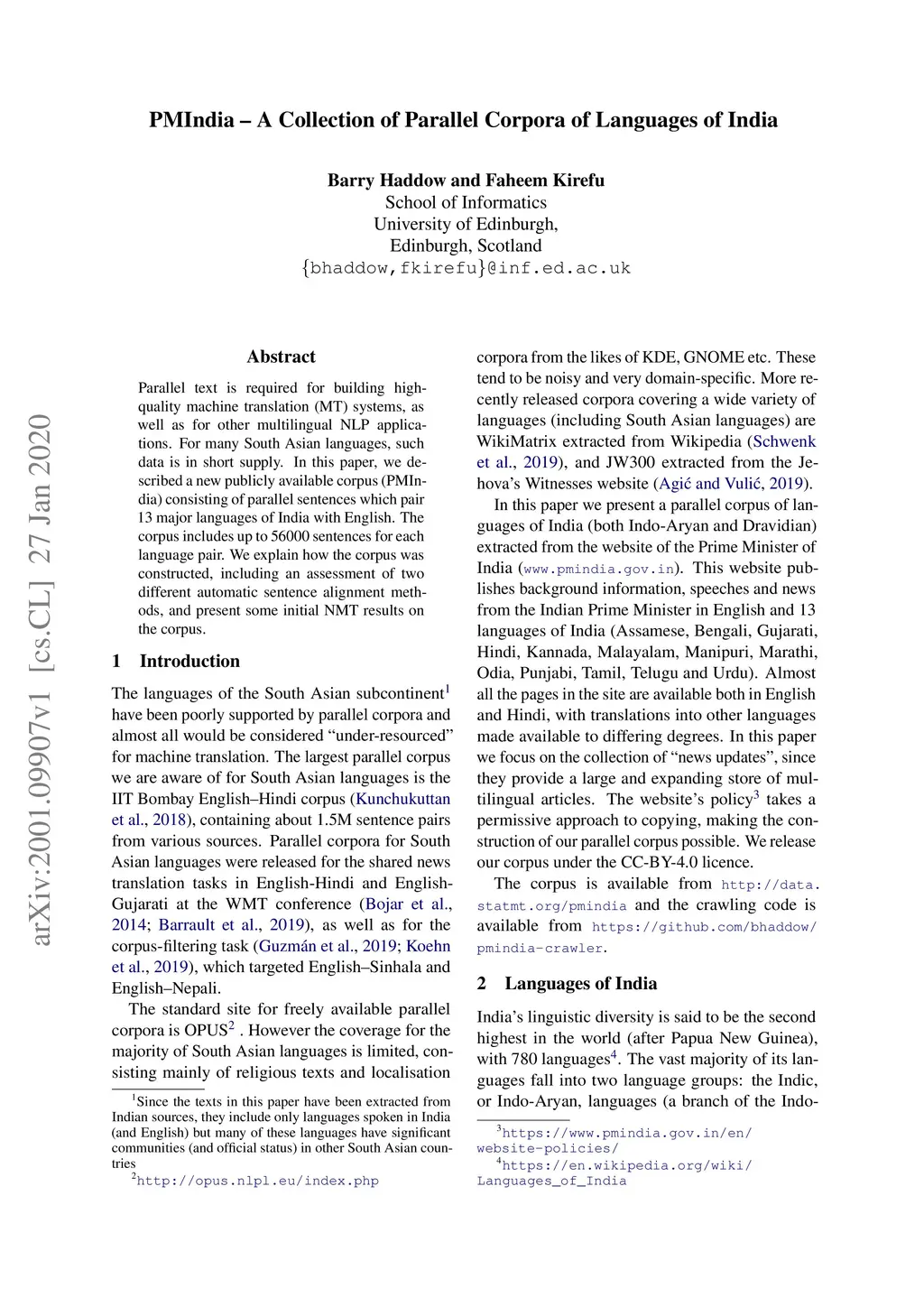 Parallel text is required for building high-quality machine translation (MT) systems, as well as for other multilingual NLP applications. For many South Asian languages, such data is in short supply. In this paper, we described a new publicly available corpus (PMIndia) consisting of parallel sentences which pair 13 major languages of India with English. The corpus includes up to 56000 sentences for each language pair. We explain how the corpus was constructed, including an assessment of two different automatic sentence alignment methods, and present some initial NMT results on the corpus.