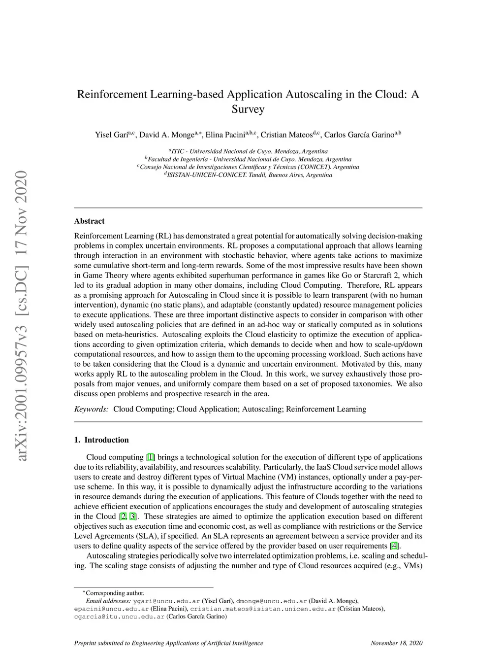 Reinforcement Learning (RL) has demonstrated a great potential for automatically solving decision-making problems in complex uncertain environments. RL proposes a computational approach that allows learning through interaction in an environment with stochastic behavior, where agents take actions to maximize some cumulative short-term and long-term rewards. Some of the most impressive results have been shown in Game Theory where agents exhibited superhuman performance in games like Go or Starcraft 2, which led to its gradual adoption in many other domains, including Cloud Computing. Therefore, RL appears as a promising approach for Autoscaling in Cloud since it is possible to learn transparent (with no human intervention), dynamic (no static plans), and adaptable (constantly updated) resource management policies to execute applications. These are three important distinctive aspects to consider in comparison with other widely used autoscaling policies that are defined in an ad-hoc way or statically computed as in solutions based on meta-heuristics. Autoscaling exploits the Cloud elasticity to optimize the execution of applications according to given optimization criteria, which demands to decide when and how to scale-up/down computational resources, and how to assign them to the upcoming processing workload. Such actions have to be taken considering that the Cloud is a dynamic and uncertain environment. Motivated by this, many works apply RL to the autoscaling problem in the Cloud. In this work, we survey exhaustively those proposals from major venues, and uniformly compare them based on a set of proposed taxonomies. We also discuss open problems and prospective research in the area.