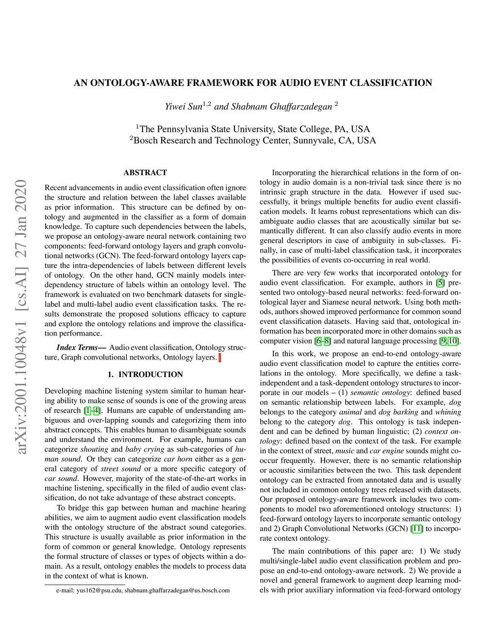 Recent advancements in audio event classification often ignore the structure and relation between the label classes available as prior information. This structure can be defined by ontology and augmented in the classifier as a form of domain knowledge. To capture such dependencies between the labels, we propose an ontology-aware neural network containing two components: feed-forward ontology layers and graph convolutional networks (GCN). The feed-forward ontology layers capture the intra-dependencies of labels between different levels of ontology. On the other hand, GCN mainly models inter-dependency structure of labels within an ontology level. The framework is evaluated on two benchmark datasets for single-label and multi-label audio event classification tasks. The results demonstrate the proposed solutions efficacy to capture and explore the ontology relations and improve the classification performance.