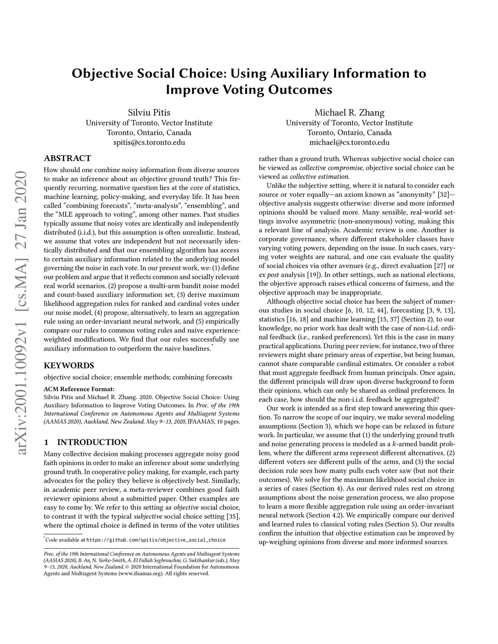How should one combine noisy information from diverse sources to make an inference about an objective ground truth? This frequently recurring, normative question lies at the core of statistics, machine learning, policy-making, and everyday life. It has been called "combining forecasts", "meta-analysis", "ensembling", and the "MLE approach to voting", among other names. Past studies typically assume that noisy votes are identically and independently distributed (i.i.d.), but this assumption is often unrealistic. Instead, we assume that votes are independent but not necessarily identically distributed and that our ensembling algorithm has access to certain auxiliary information related to the underlying model governing the noise in each vote. In our present work, we: (1) define our problem and argue that it reflects common and socially relevant real world scenarios, (2) propose a multi-arm bandit noise model and count-based auxiliary information set, (3) derive maximum likelihood aggregation rules for ranked and cardinal votes under our noise model, (4) propose, alternatively, to learn an aggregation rule using an order-invariant neural network, and (5) empirically compare our rules to common voting rules and naive experience-weighted modifications. We find that our rules successfully use auxiliary information to outperform the naive baselines.