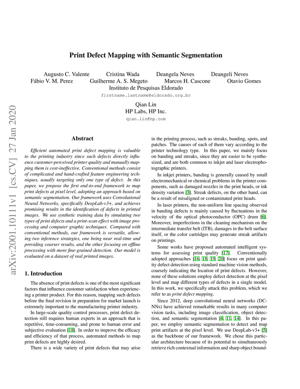 Efficient automated print defect mapping is valuable to the printing industry since such defects directly influence customer-perceived printer quality and manually mapping them is cost-ineffective. Conventional methods consist of complicated and hand-crafted feature engineering techniques, usually targeting only one type of defect. In this paper, we propose the first end-to-end framework to map print defects at pixel level, adopting an approach based on semantic segmentation. Our framework uses Convolutional Neural Networks, specifically DeepLab-v3+, and achieves promising results in the identification of defects in printed images. We use synthetic training data by simulating two types of print defects and a print-scan effect with image processing and computer graphic techniques. Compared with conventional methods, our framework is versatile, allowing two inference strategies, one being near real-time and providing coarser results, and the other focusing on offline processing with more fine-grained detection. Our model is evaluated on a dataset of real printed images.