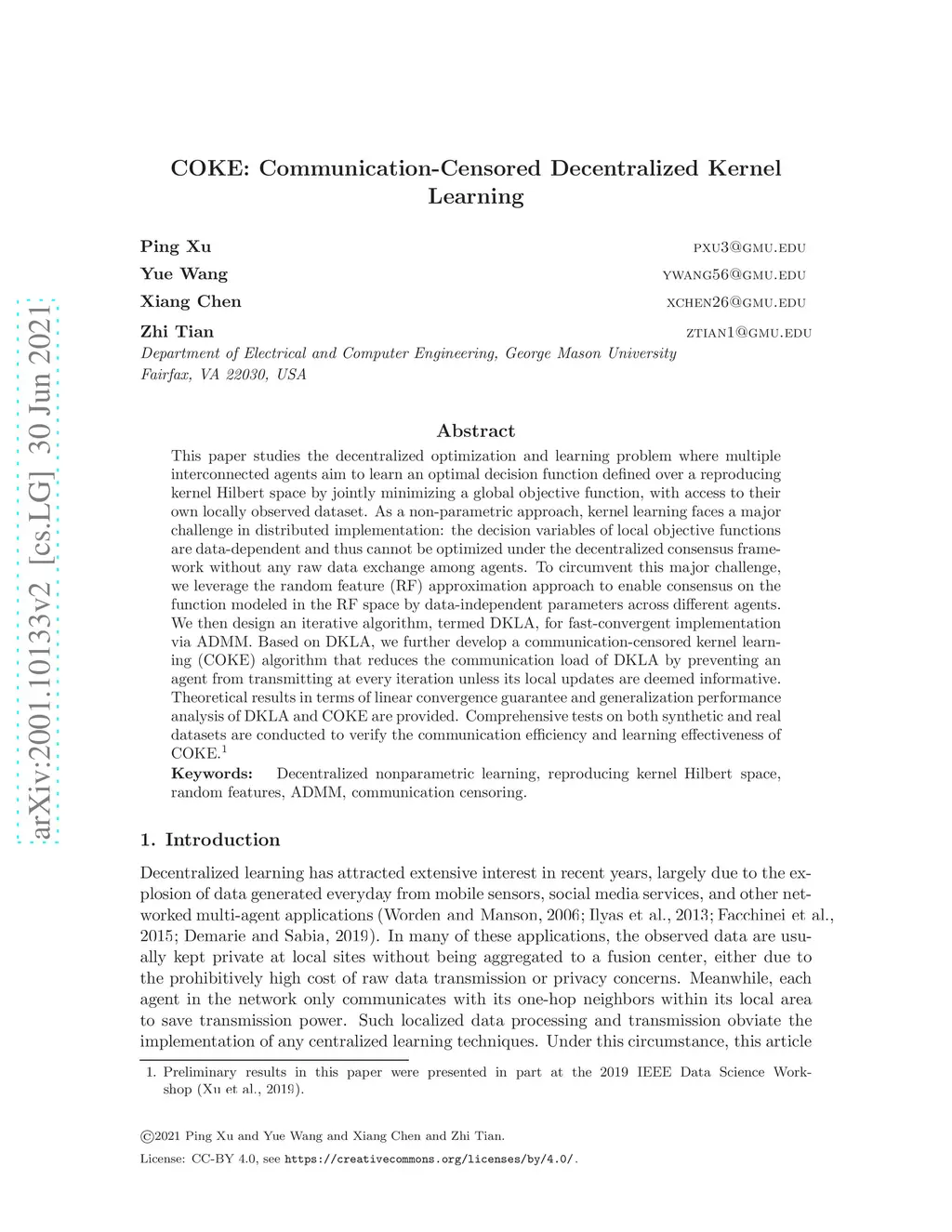 This paper studies the decentralized optimization and learning problem where multiple interconnected agents aim to learn an optimal decision function defined over a reproducing kernel Hilbert space by jointly minimizing a global objective function, with access to their own locally observed dataset. As a non-parametric approach, kernel learning faces a major challenge in distributed implementation: the decision variables of local objective functions are data-dependent and thus cannot be optimized under the decentralized consensus framework without any raw data exchange among agents. To circumvent this major challenge, we leverage the random feature (RF) approximation approach to enable consensus on the function modeled in the RF space by data-independent parameters across different agents. We then design an iterative algorithm, termed DKLA, for fast-convergent implementation via ADMM. Based on DKLA, we further develop a communication-censored kernel learning (COKE) algorithm that reduces the communication load of DKLA by preventing an agent from transmitting at every iteration unless its local updates are deemed informative. Theoretical results in terms of linear convergence guarantee and generalization performance analysis of DKLA and COKE are provided. Comprehensive tests on both synthetic and real datasets are conducted to verify the communication efficiency and learning effectiveness of COKE.