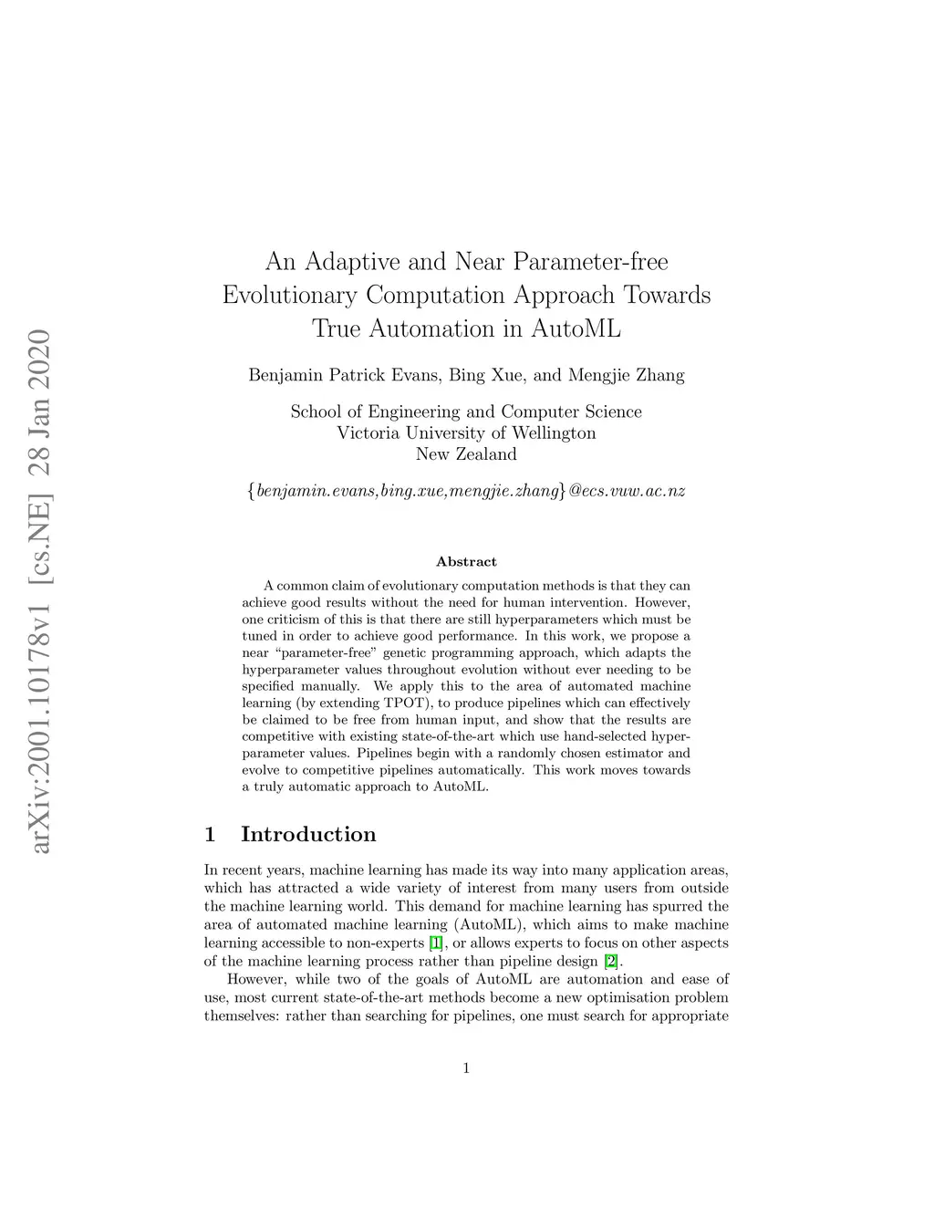 A common claim of evolutionary computation methods is that they can achieve good results without the need for human intervention. However, one criticism of this is that there are still hyperparameters which must be tuned in order to achieve good performance. In this work, we propose a near "parameter-free" genetic programming approach, which adapts the hyperparameter values throughout evolution without ever needing to be specified manually. We apply this to the area of automated machine learning (by extending TPOT), to produce pipelines which can effectively be claimed to be free from human input, and show that the results are competitive with existing state-of-the-art which use hand-selected hyperparameter values. Pipelines begin with a randomly chosen estimator and evolve to competitive pipelines automatically. This work moves towards a truly automatic approach to AutoML.