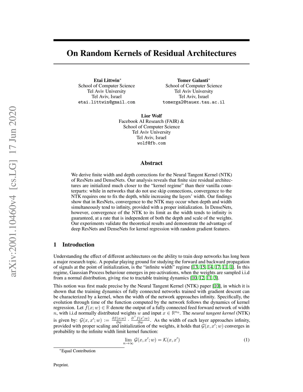 We derive finite width and depth corrections for the Neural Tangent Kernel (NTK) of ResNets and DenseNets. Our analysis reveals that finite size residual architectures are initialized much closer to the "kernel regime" than their vanilla counterparts: while in networks that do not use skip connections, convergence to the NTK requires one to fix the depth, while increasing the layers' width. Our findings show that in ResNets, convergence to the NTK may occur when depth and width simultaneously tend to infinity, provided with a proper initialization. In DenseNets, however, convergence of the NTK to its limit as the width tends to infinity is guaranteed, at a rate that is independent of both the depth and scale of the weights. Our experiments validate the theoretical results and demonstrate the advantage of deep ResNets and DenseNets for kernel regression with random gradient features.