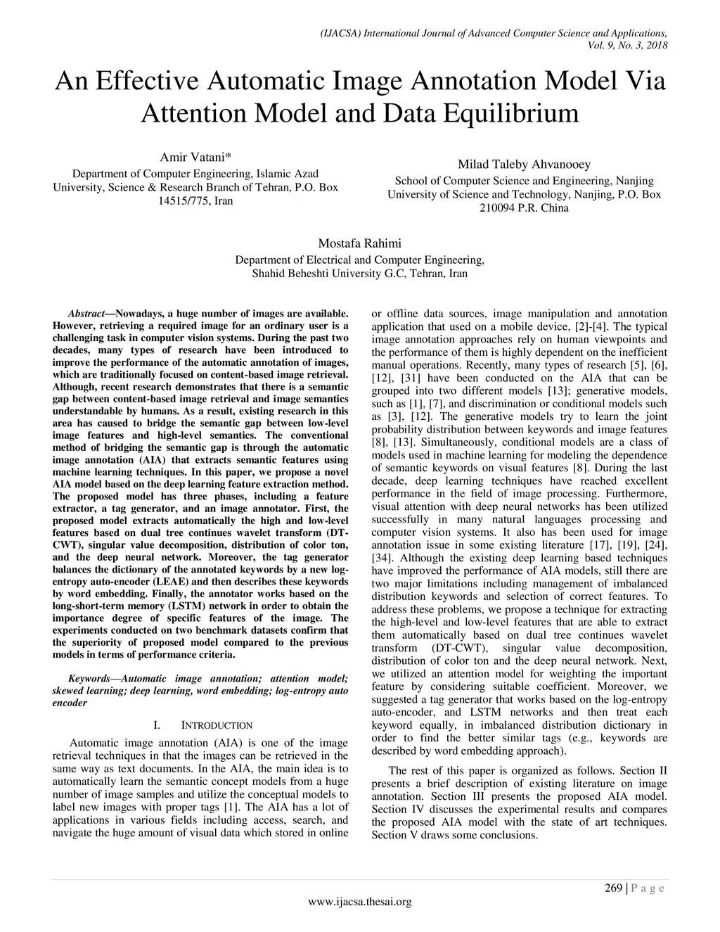 Nowadays, a huge number of images are available. However, retrieving a required image for an ordinary user is a challenging task in computer vision systems. During the past two decades, many types of research have been introduced to improve the performance of the automatic annotation of images, which are traditionally focused on content-based image retrieval. Although, recent research demonstrates that there is a semantic gap between content-based image retrieval and image semantics understandable by humans. As a result, existing research in this area has caused to bridge the semantic gap between low-level image features and high-level semantics. The conventional method of bridging the semantic gap is through the automatic image annotation (AIA) that extracts semantic features using machine learning techniques. In this paper, we propose a novel AIA model based on the deep learning feature extraction method. The proposed model has three phases, including a feature extractor, a tag generator, and an image annotator. First, the proposed model extracts automatically the high and low-level features based on dual-tree continues wavelet transform (DT-CWT), singular value decomposition, distribution of color ton, and the deep neural network. Moreover, the tag generator balances the dictionary of the annotated keywords by a new log-entropy auto-encoder (LEAE) and then describes these keywords by word embedding. Finally, the annotator works based on the long-short-term memory (LSTM) network in order to obtain the importance degree of specific features of the image. The experiments conducted on two benchmark datasets confirm that the superiority of the proposed model compared to the previous models in terms of performance criteria.
