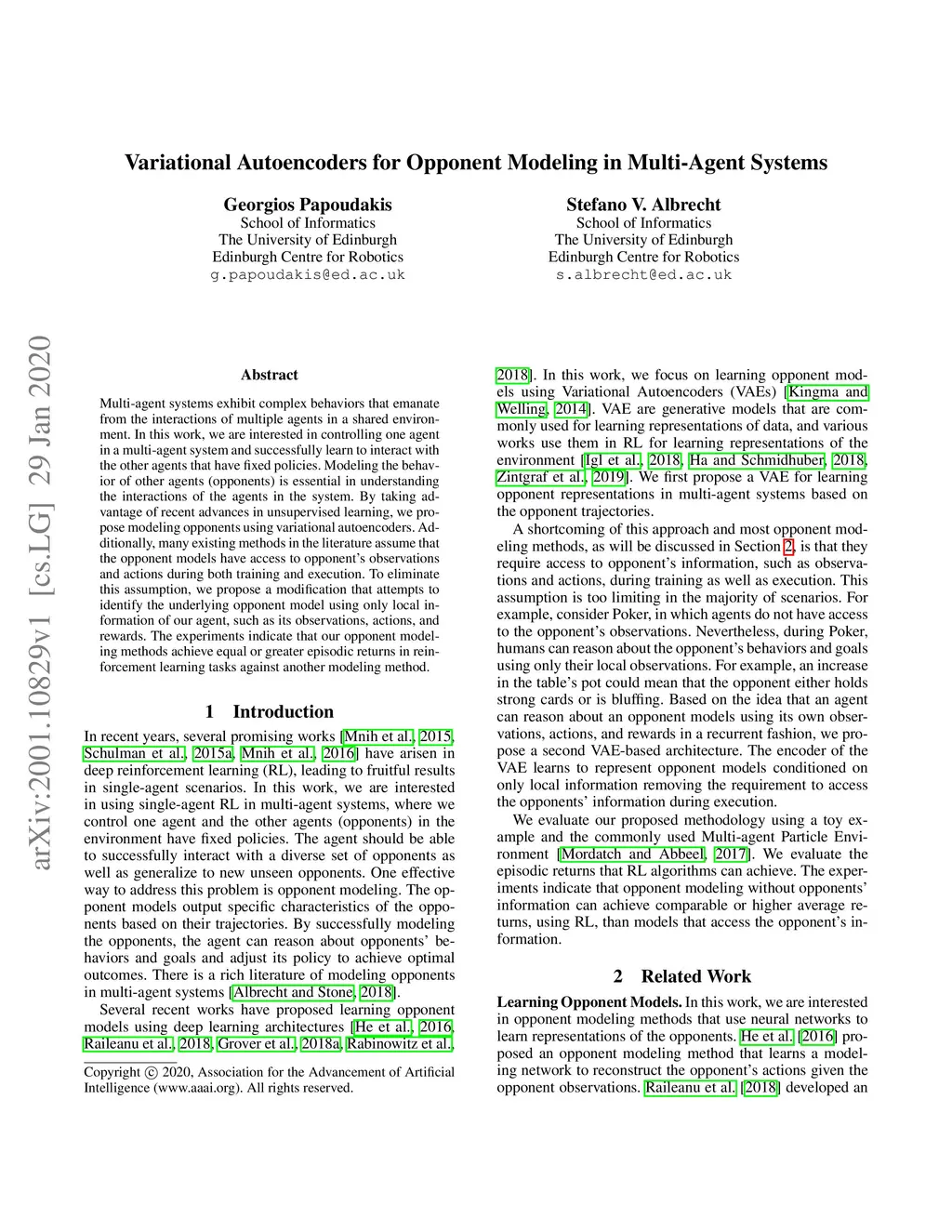 Multi-agent systems exhibit complex behaviors that emanate from the interactions of multiple agents in a shared environment. In this work, we are interested in controlling one agent in a multi-agent system and successfully learn to interact with the other agents that have fixed policies. Modeling the behavior of other agents (opponents) is essential in understanding the interactions of the agents in the system. By taking advantage of recent advances in unsupervised learning, we propose modeling opponents using variational autoencoders. Additionally, many existing methods in the literature assume that the opponent models have access to opponent's observations and actions during both training and execution. To eliminate this assumption, we propose a modification that attempts to identify the underlying opponent model using only local information of our agent, such as its observations, actions, and rewards. The experiments indicate that our opponent modeling methods achieve equal or greater episodic returns in reinforcement learning tasks against another modeling method.