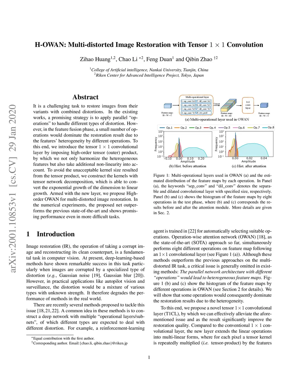 H-OWAN: Multi-distorted Image Restoration with Tensor 1x1 Convolution