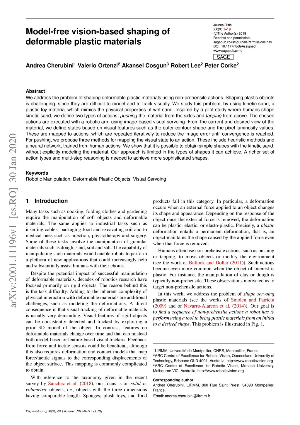 We address the problem of shaping deformable plastic materials using non-prehensile actions. Shaping plastic objects is challenging, since they are difficult to model and to track visually. We study this problem, by using kinetic sand, a plastic toy material which mimics the physical properties of wet sand. Inspired by a pilot study where humans shape kinetic sand, we define two types of actions: \textit{pushing} the material from the sides and \textit{tapping} from above. The chosen actions are executed with a robotic arm using image-based visual servoing. From the current and desired view of the material, we define states based on visual features such as the outer contour shape and the pixel luminosity values. These are mapped to actions, which are repeated iteratively to reduce the image error until convergence is reached. For pushing, we propose three methods for mapping the visual state to an action. These include heuristic methods and a neural network, trained from human actions. We show that it is possible to obtain simple shapes with the kinetic sand, without explicitly modeling the material. Our approach is limited in the types of shapes it can achieve. A richer set of action types and multi-step reasoning is needed to achieve more sophisticated shapes.