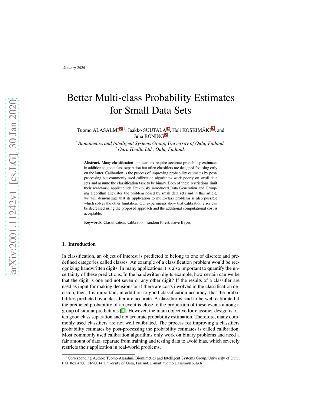 Many classification applications require accurate probability estimates in addition to good class separation but often classifiers are designed focusing only on the latter. Calibration is the process of improving probability estimates by post-processing but commonly used calibration algorithms work poorly on small data sets and assume the classification task to be binary. Both of these restrictions limit their real-world applicability. Previously introduced Data Generation and Grouping algorithm alleviates the problem posed by small data sets and in this article, we will demonstrate that its application to multi-class problems is also possible which solves the other limitation. Our experiments show that calibration error can be decreased using the proposed approach and the additional computational cost is acceptable.