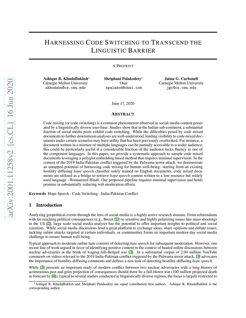 Code mixing (or code switching) is a common phenomenon observed in social-media content generated by a linguistically diverse user-base. Studies show that in the Indian sub-continent, a substantial fraction of social media posts exhibit code switching. While the difficulties posed by code mixed documents to further downstream analyses are well-understood, lending visibility to code mixed documents under certain scenarios may have utility that has been previously overlooked. For instance, a document written in a mixture of multiple languages can be partially accessible to a wider audience; this could be particularly useful if a considerable fraction of the audience lacks fluency in one of the component languages. In this paper, we provide a systematic approach to sample code mixed documents leveraging a polyglot embedding based method that requires minimal supervision. In the context of the 2019 India-Pakistan conflict triggered by the Pulwama terror attack, we demonstrate an untapped potential of harnessing code mixing for human well-being: starting from an existing hostility diffusing \emph{hope speech} classifier solely trained on English documents, code mixed documents are utilized as a bridge to retrieve \emph{hope speech} content written in a low-resource but widely used language - Romanized Hindi. Our proposed pipeline requires minimal supervision and holds promise in substantially reducing web moderation efforts.