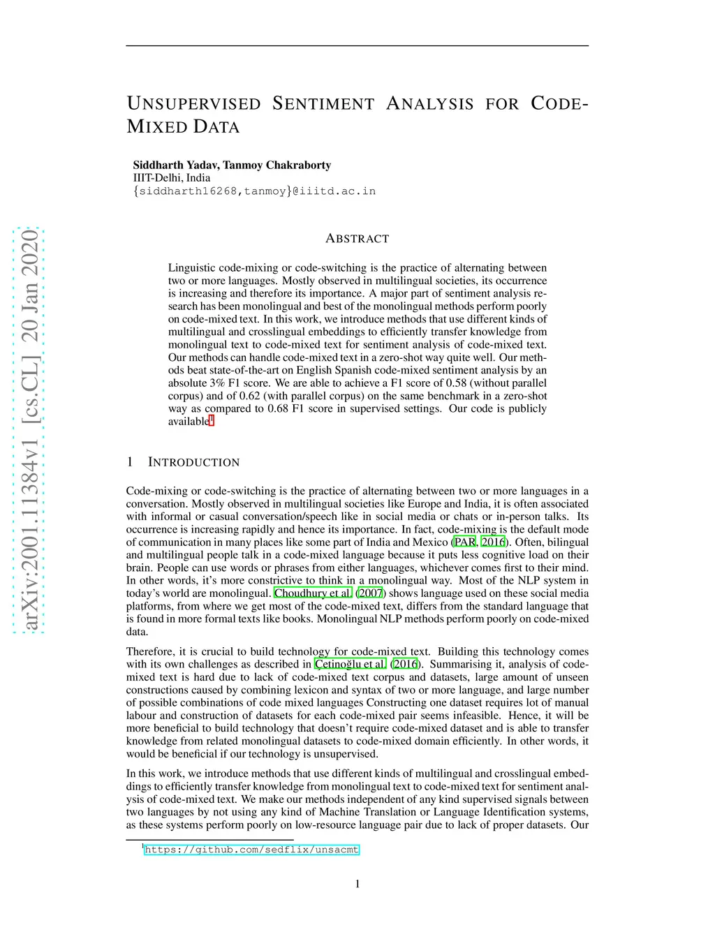 Unsupervised Sentiment Analysis for Code-mixed Data