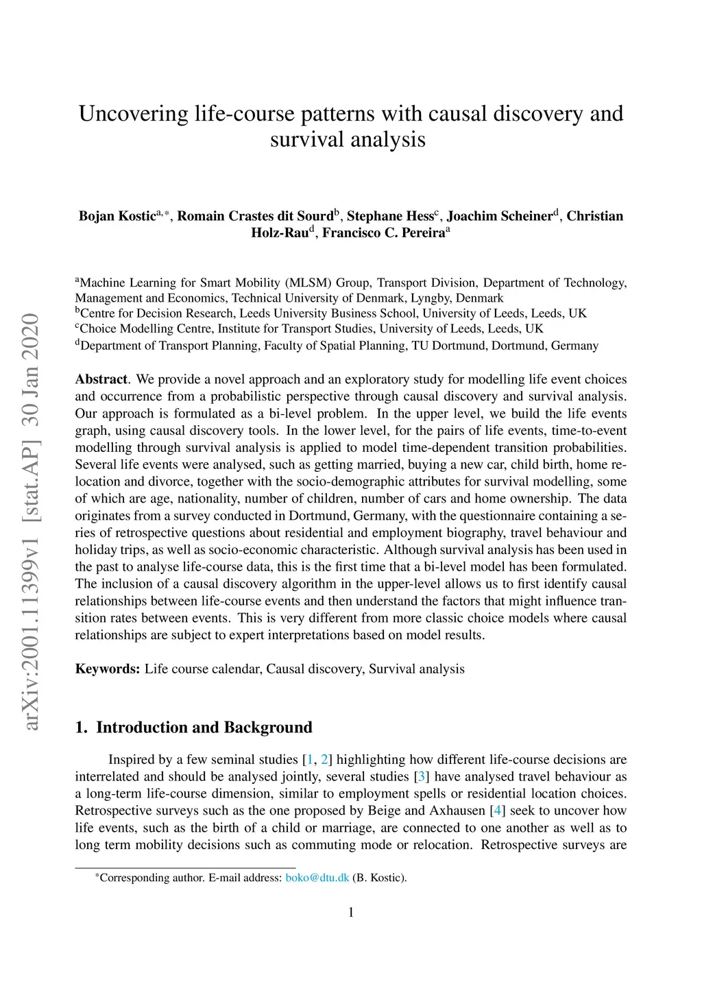 We provide a novel approach and an exploratory study for modelling life event choices and occurrence from a probabilistic perspective through causal discovery and survival analysis. Our approach is formulated as a bi-level problem. In the upper level, we build the life events graph, using causal discovery tools. In the lower level, for the pairs of life events, time-to-event modelling through survival analysis is applied to model time-dependent transition probabilities. Several life events were analysed, such as getting married, buying a new car, child birth, home relocation and divorce, together with the socio-demographic attributes for survival modelling, some of which are age, nationality, number of children, number of cars and home ownership. The data originates from a survey conducted in Dortmund, Germany, with the questionnaire containing a series of retrospective questions about residential and employment biography, travel behaviour and holiday trips, as well as socio-economic characteristic. Although survival analysis has been used in the past to analyse life-course data, this is the first time that a bi-level model has been formulated. The inclusion of a causal discovery algorithm in the upper-level allows us to first identify causal relationships between life-course events and then understand the factors that might influence transition rates between events. This is very different from more classic choice models where causal relationships are subject to expert interpretations based on model results.