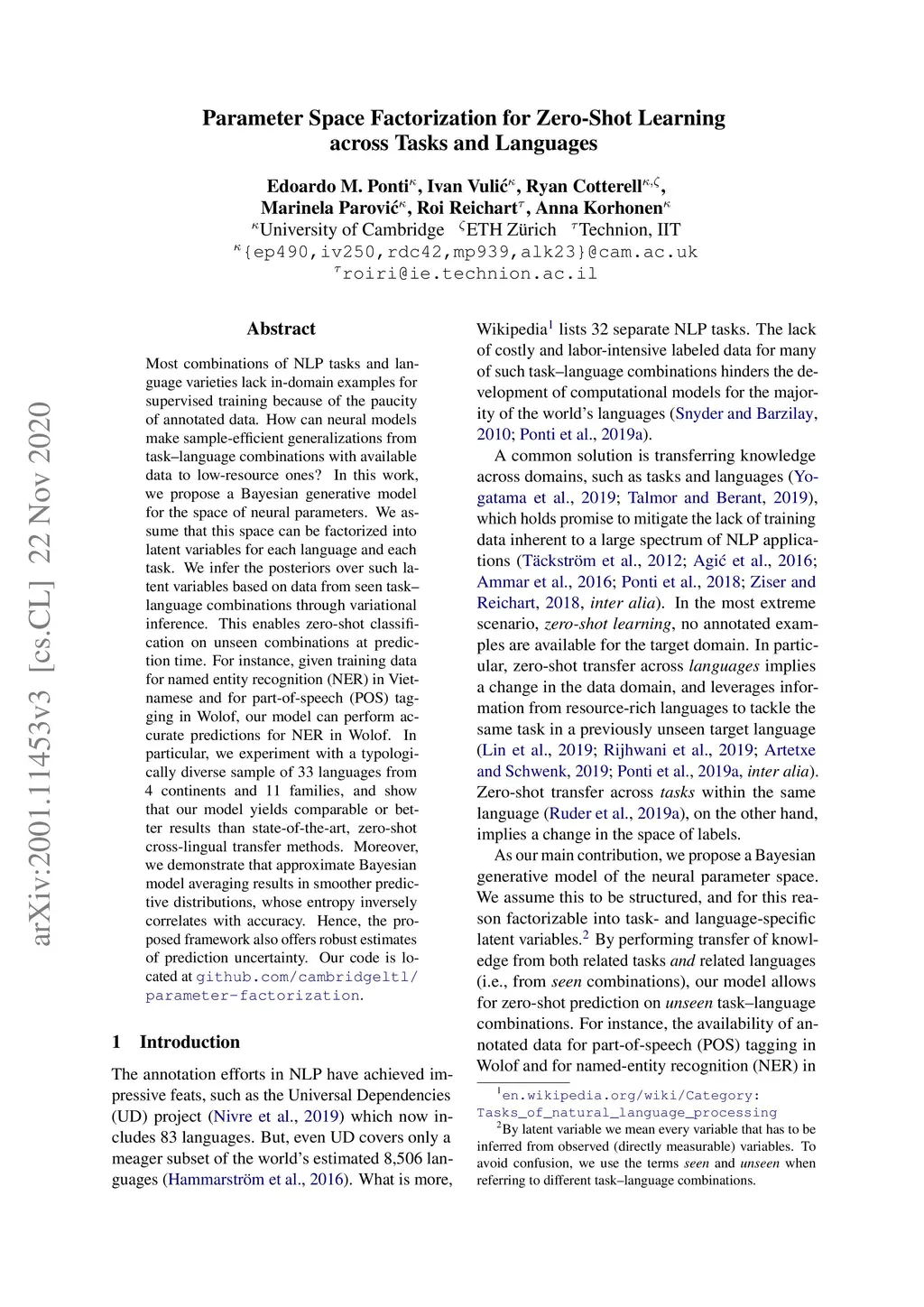 Most combinations of NLP tasks and language varieties lack in-domain examples for supervised training because of the paucity of annotated data. How can neural models make sample-efficient generalizations from task-language combinations with available data to low-resource ones? In this work, we propose a Bayesian generative model for the space of neural parameters. We assume that this space can be factorized into latent variables for each language and each task. We infer the posteriors over such latent variables based on data from seen task-language combinations through variational inference. This enables zero-shot classification on unseen combinations at prediction time. For instance, given training data for named entity recognition (NER) in Vietnamese and for part-of-speech (POS) tagging in Wolof, our model can perform accurate predictions for NER in Wolof. In particular, we experiment with a typologically diverse sample of 33 languages from 4 continents and 11 families, and show that our model yields comparable or better results than state-of-the-art, zero-shot cross-lingual transfer methods. Moreover, we demonstrate that approximate Bayesian model averaging results in smoother predictive distributions, whose entropy inversely correlates with accuracy. Hence, the proposed framework also offers robust estimates of prediction uncertainty. Our code is located at github.com/cambridgeltl/parameter-factorization