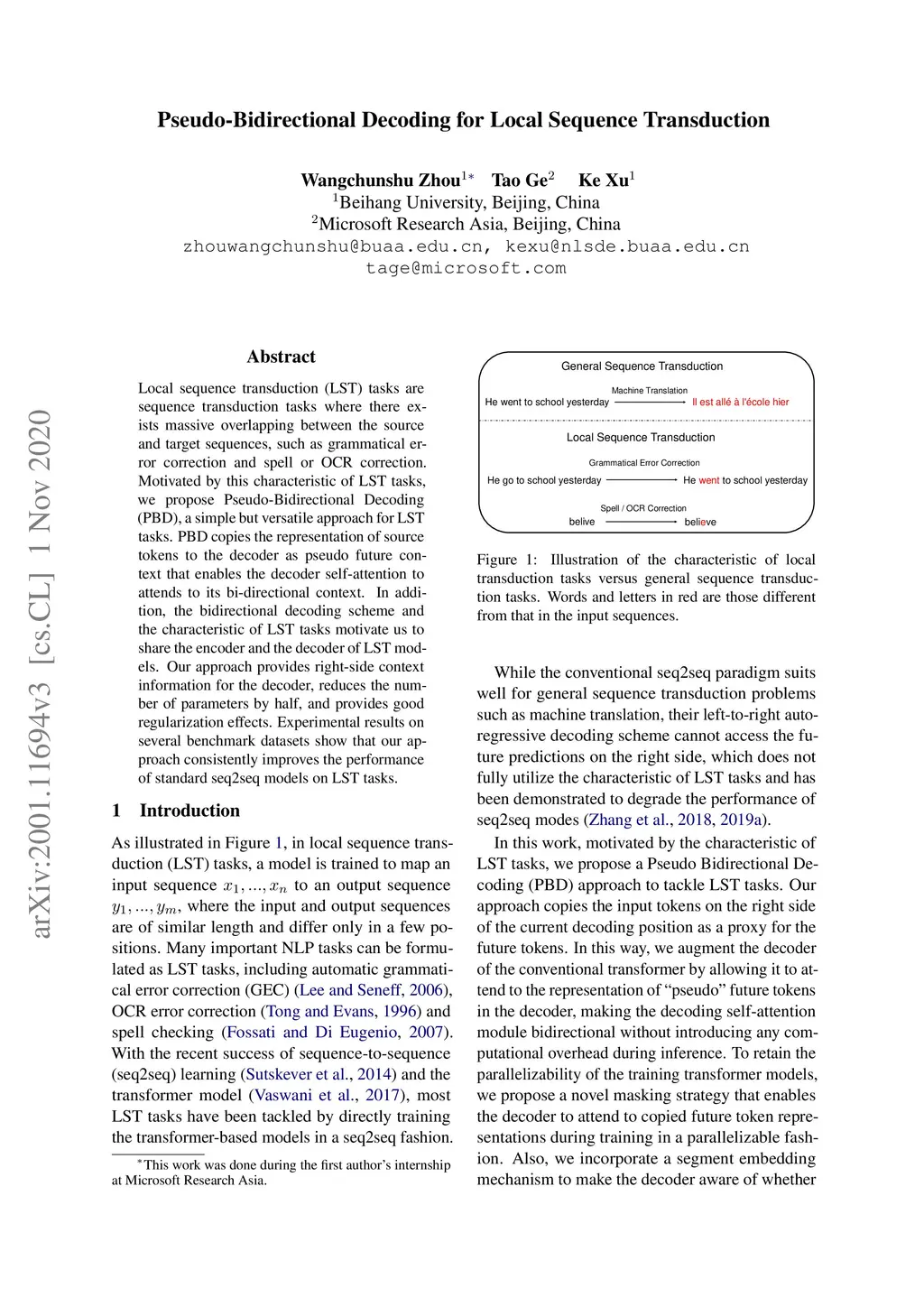 Pseudo-Bidirectional Decoding for Local Sequence Transduction