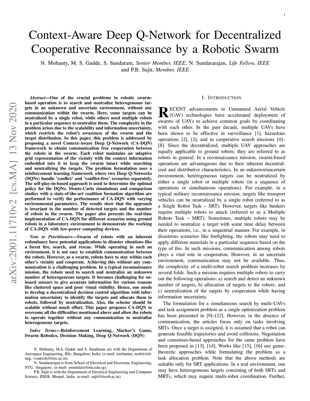 One of the crucial problems in robotic swarm-based operation is to search and neutralize heterogeneous targets in an unknown and uncertain environment, without any communication within the swarm. Here, some targets can be neutralized by a single robot, while others need multiple robots in a particular sequence to neutralize them. The complexity in the problem arises due to the scalability and information uncertainty, which restricts the robot's awareness of the swarm and the target distribution. In this paper, this problem is addressed by proposing a novel Context-Aware Deep Q-Network (CA-DQN) framework to obtain communication free cooperation between the robots in the swarm. Each robot maintains an adaptive grid representation of the vicinity with the context information embedded into it to keep the swarm intact while searching and neutralizing the targets. The problem formulation uses a reinforcement learning framework where two Deep Q-Networks (DQNs) handle 'conflict' and 'conflict-free' scenarios separately. The self-play-in-based approach is used to determine the optimal policy for the DQNs. Monte-Carlo simulations and comparison studies with a state-of-the-art coalition formation algorithm are performed to verify the performance of CA-DQN with varying environmental parameters. The results show that the approach is invariant to the number of detected targets and the number of robots in the swarm. The paper also presents the real-time implementation of CA-DQN for different scenarios using ground robots in a laboratory environment to demonstrate the working of CA-DQN with low-power computing devices.