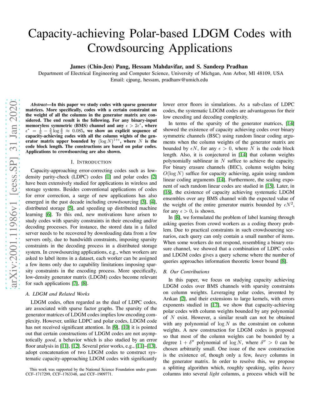 In this paper we study codes with sparse generator matrices. More specifically, codes with a certain constraint on the weight of all the columns in the generator matrix are considered. The end result is the following. For any binary-input memoryless symmetric (BMS) channel and any epsilon > 2 epsilon*, where epsilon^* = \frac{1}{6}-\frac{5}{3}\log{\frac{4}{3}} \approx 0.085, we show an explicit sequence of capacity-achieving codes with all the column wights of the generator matrix upper bounded by (\log N)^{1+epsilon}, where N is the code block length. The constructions are based on polar codes. Applications to crowdsourcing are also shown.