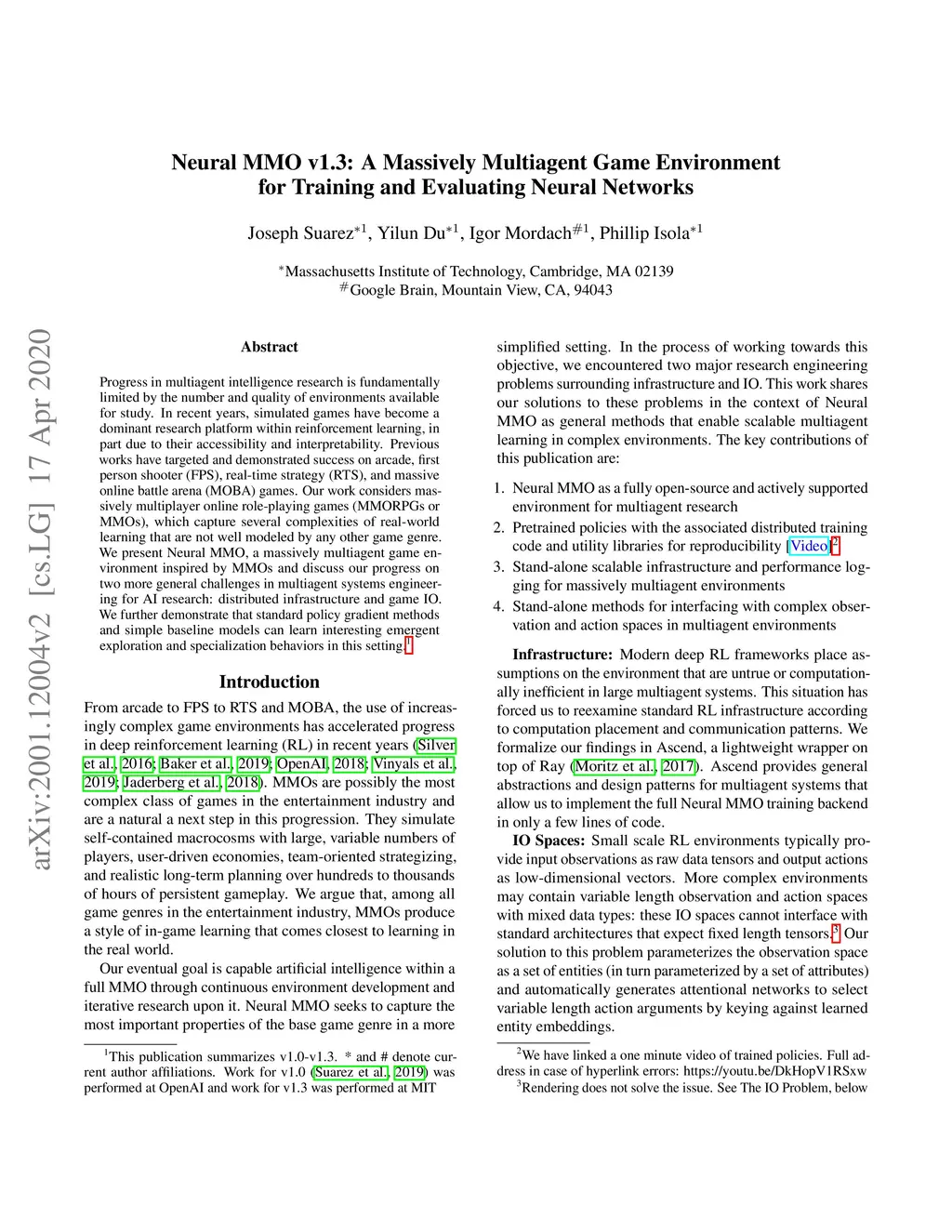 Progress in multiagent intelligence research is fundamentally limited by the number and quality of environments available for study. In recent years, simulated games have become a dominant research platform within reinforcement learning, in part due to their accessibility and interpretability. Previous works have targeted and demonstrated success on arcade, first person shooter (FPS), real-time strategy (RTS), and massive online battle arena (MOBA) games. Our work considers massively multiplayer online role-playing games (MMORPGs or MMOs), which capture several complexities of real-world learning that are not well modeled by any other game genre. We present Neural MMO, a massively multiagent game environment inspired by MMOs and discuss our progress on two more general challenges in multiagent systems engineering for AI research: distributed infrastructure and game IO. We further demonstrate that standard policy gradient methods and simple baseline models can learn interesting emergent exploration and specialization behaviors in this setting.