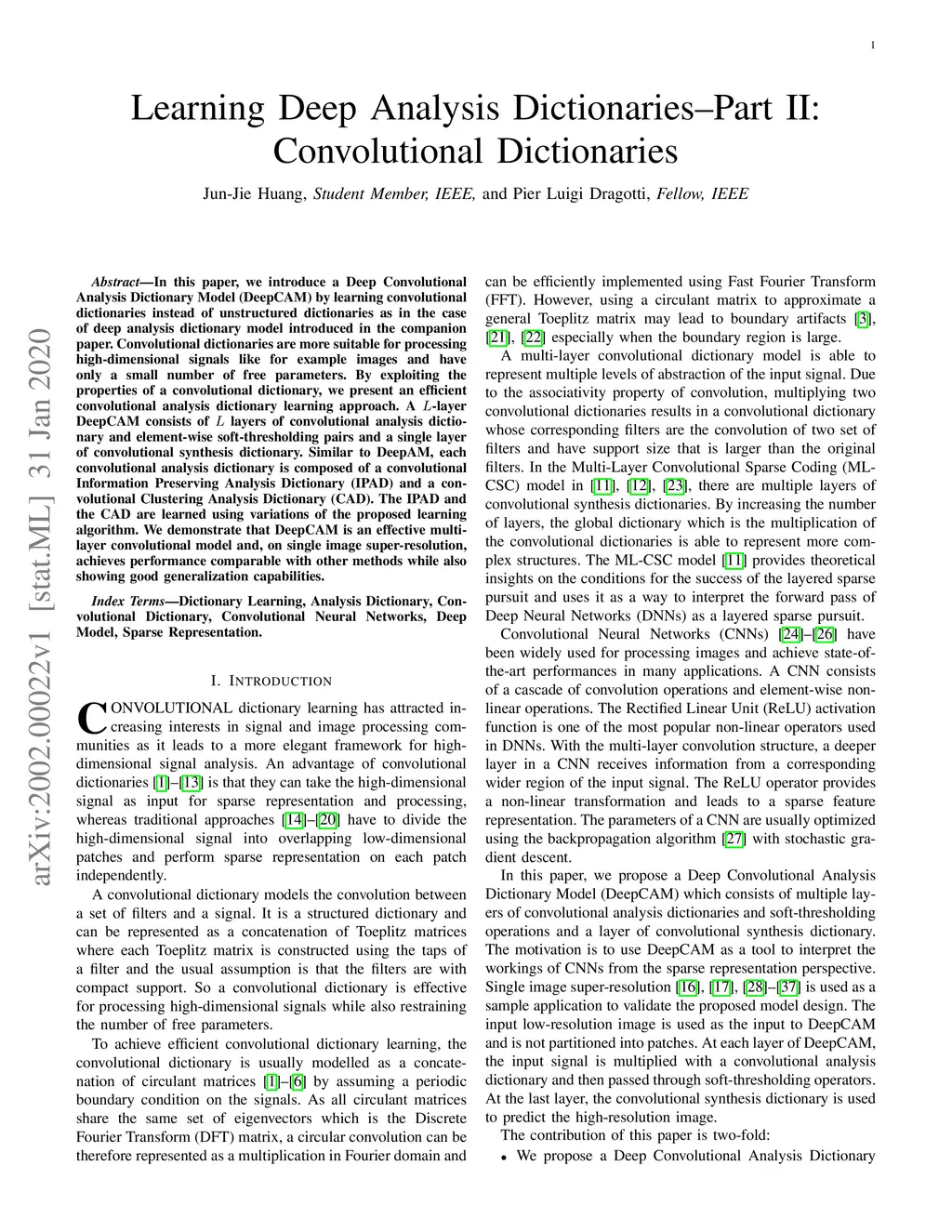In this paper, we introduce a Deep Convolutional Analysis Dictionary Model (DeepCAM) by learning convolutional dictionaries instead of unstructured dictionaries as in the case of deep analysis dictionary model introduced in the companion paper. Convolutional dictionaries are more suitable for processing high-dimensional signals like for example images and have only a small number of free parameters. By exploiting the properties of a convolutional dictionary, we present an efficient convolutional analysis dictionary learning approach. A L-layer DeepCAM consists of L layers of convolutional analysis dictionary and element-wise soft-thresholding pairs and a single layer of convolutional synthesis dictionary. Similar to DeepAM, each convolutional analysis dictionary is composed of a convolutional Information Preserving Analysis Dictionary (IPAD) and a convolutional Clustering Analysis Dictionary (CAD). The IPAD and the CAD are learned using variations of the proposed learning algorithm. We demonstrate that DeepCAM is an effective multilayer convolutional model and, on single image super-resolution, achieves performance comparable with other methods while also showing good generalization capabilities.