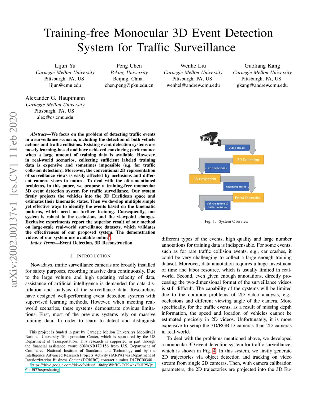 We focus on the problem of detecting traffic events in a surveillance scenario, including the detection of both vehicle actions and traffic collisions. Existing event detection systems are mostly learning-based and have achieved convincing performance when a large amount of training data is available. However, in real-world scenarios, collecting sufficient labeled training data is expensive and sometimes impossible (e.g. for traffic collision detection). Moreover, the conventional 2D representation of surveillance views is easily affected by occlusions and different camera views in nature. To deal with the aforementioned problems, in this paper, we propose a training-free monocular 3D event detection system for traffic surveillance. Our system firstly projects the vehicles into the 3D Euclidean space and estimates their kinematic states. Then we develop multiple simple yet effective ways to identify the events based on the kinematic patterns, which need no further training. Consequently, our system is robust to the occlusions and the viewpoint changes. Exclusive experiments report the superior result of our method on large-scale real-world surveillance datasets, which validates the effectiveness of our proposed system.