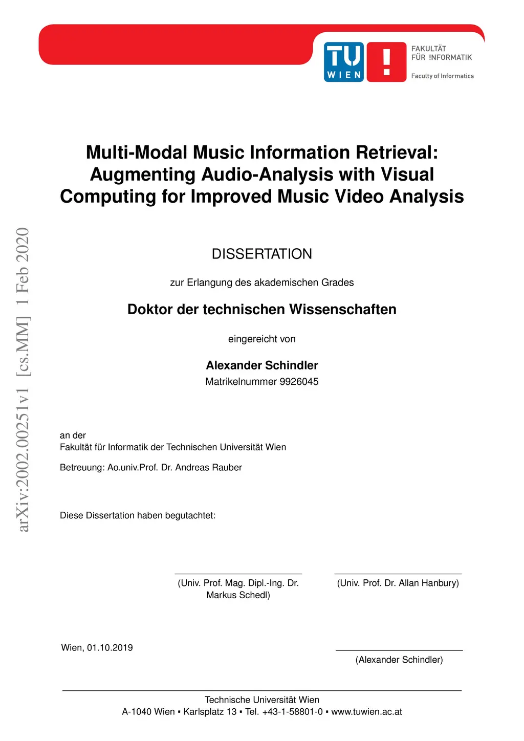 This thesis combines audio-analysis with computer vision to approach Music Information Retrieval (MIR) tasks from a multi-modal perspective. This thesis focuses on the information provided by the visual layer of music videos and how it can be harnessed to augment and improve tasks of the MIR research domain. The main hypothesis of this work is based on the observation that certain expressive categories such as genre or theme can be recognized on the basis of the visual content alone, without the sound being heard. This leads to the hypothesis that there exists a visual language that is used to express mood or genre. In a further consequence it can be concluded that this visual information is music related and thus should be beneficial for the corresponding MIR tasks such as music genre classification or mood recognition. A series of comprehensive experiments and evaluations are conducted which are focused on the extraction of visual information and its application in different MIR tasks. A custom dataset is created, suitable to develop and test visual features which are able to represent music related information. Evaluations range from low-level visual features to high-level concepts retrieved by means of Deep Convolutional Neural Networks. Additionally, new visual features are introduced capturing rhythmic visual patterns. In all of these experiments the audio-based results serve as benchmark for the visual and audio-visual approaches. The experiments are conducted for three MIR tasks Artist Identification, Music Genre Classification and Cross-Genre Classification. Experiments show that an audio-visual approach harnessing high-level semantic information gained from visual concept detection, outperforms audio-only genre-classification accuracy by 16.43%.