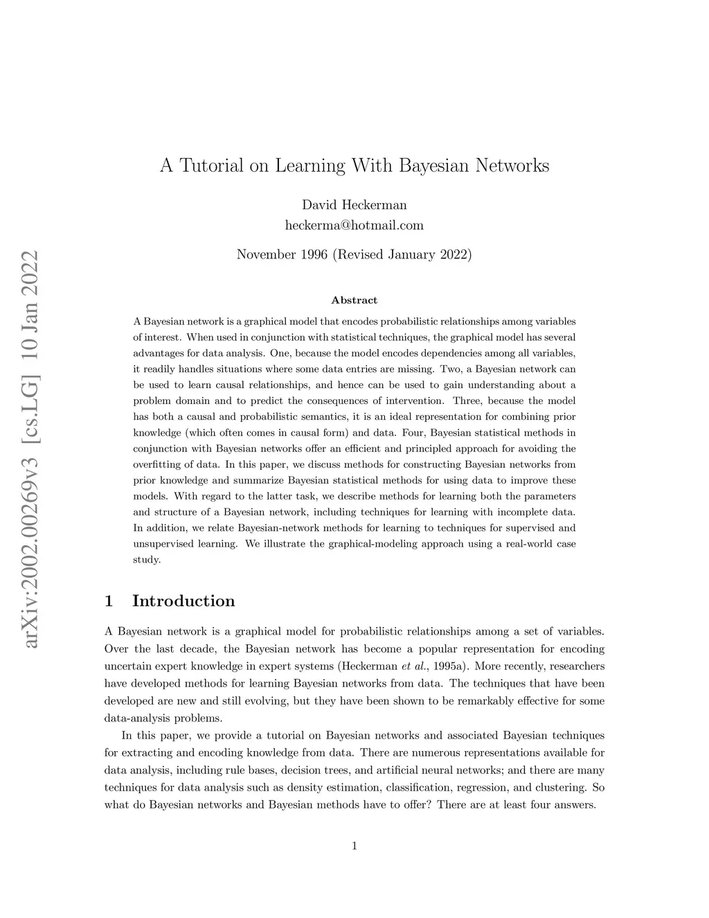 A Bayesian network is a graphical model that encodes probabilistic relationships among variables of interest. When used in conjunction with statistical techniques, the graphical model has several advantages for data analysis. One, because the model encodes dependencies among all variables, it readily handles situations where some data entries are missing. Two, a Bayesian network can be used to learn causal relationships, and hence can be used to gain understanding about a problem domain and to predict the consequences of intervention. Three, because the model has both a causal and probabilistic semantics, it is an ideal representation for combining prior knowledge (which often comes in causal form) and data. Four, Bayesian statistical methods in conjunction with Bayesian networks offer an efficient and principled approach for avoiding the overfitting of data. In this paper, we discuss methods for constructing Bayesian networks from prior knowledge and summarize Bayesian statistical methods for using data to improve these models. With regard to the latter task, we describe methods for learning both the parameters and structure of a Bayesian network, including techniques for learning with incomplete data. In addition, we relate Bayesian-network methods for learning to techniques for supervised and unsupervised learning. We illustrate the graphical-modeling approach using a real-world case study.