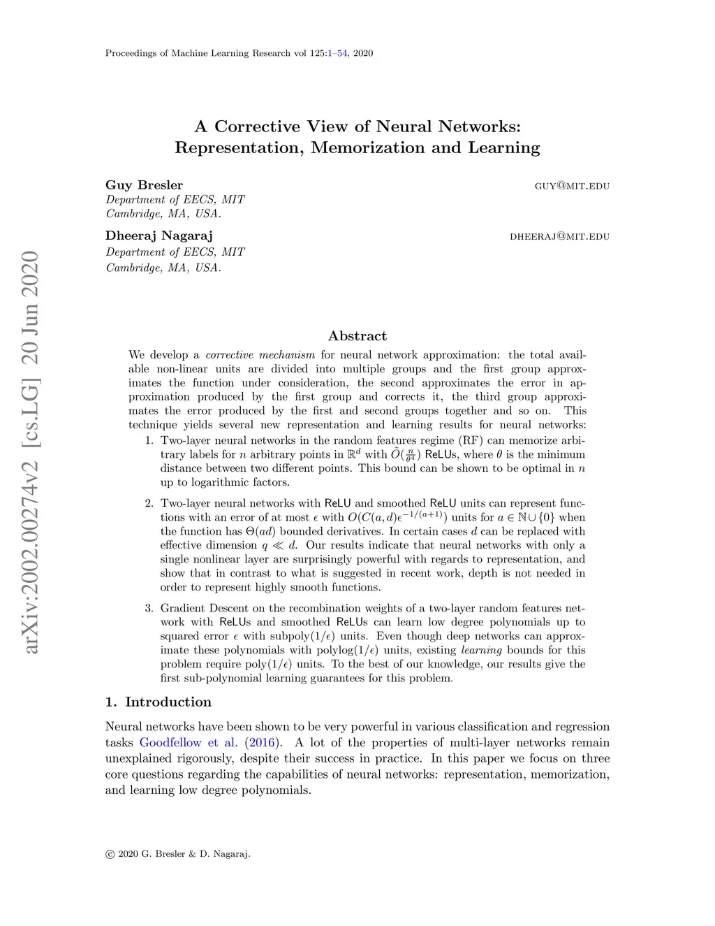 We develop a corrective mechanism for neural network approximation: the total available non-linear units are divided into multiple groups and the first group approximates the function under consideration, the second group approximates the error in approximation produced by the first group and corrects it, the third group approximates the error produced by the first and second groups together and so on. This technique yields several new representation and learning results for neural networks. First, we show that two-layer neural networks in the random features regime (RF) can memorize arbitrary labels for arbitrary points under under Euclidean distance separation condition using ReLUs which is optimal in up to logarithmic factors. Next, we give a powerful representation result for two-layer neural networks with ReLUs and smoothed ReLUs which can achieve a squared error of at most with for when the function is smooth enough (roughly when it has bounded derivatives). In certain cases can be replaced with effective dimension . Previous results of this type implement Taylor series approximation using deep architectures. We also consider three-layer neural networks and show that the corrective mechanism yields faster representation rates for smooth radial functions. Lastly, we obtain the first upper bound on the number of neurons required for a two layer network to learn low degree polynomials up to squared error via gradient descent. Even though deep networks can express these polynomials with neurons, the best learning bounds on this problem require neurons.