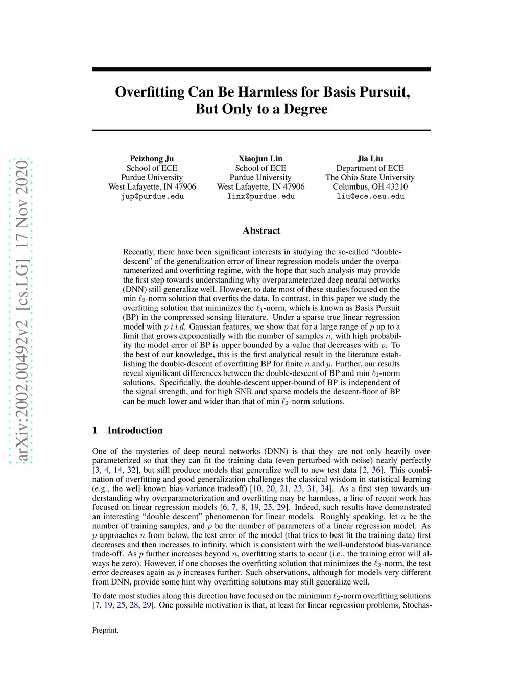 Recently, there have been significant interests in studying the so-called "double-descent" of the generalization error of linear regression models under the overparameterized and overfitting regime, with the hope that such analysis may provide the first step towards understanding why overparameterized deep neural networks (DNN) still generalize well. However, to date most of these studies focused on the min -norm solution that overfits the data. In contrast, in this paper we study the overfitting solution that minimizes the -norm, which is known as Basis Pursuit (BP) in the compressed sensing literature. Under a sparse true linear regression model with i.i.d. Gaussian features, we show that for a large range of up to a limit that grows exponentially with the number of samples , with high probability the model error of BP is upper bounded by a value that decreases with . To the best of our knowledge, this is the first analytical result in the literature establishing the double-descent of overfitting BP for finite and . Further, our results reveal significant differences between the double-descent of BP and min -norm solutions. Specifically, the double-descent upper-bound of BP is independent of the signal strength, and for high SNR and sparse models the descent-floor of BP can be much lower and wider than that of min -norm solutions.