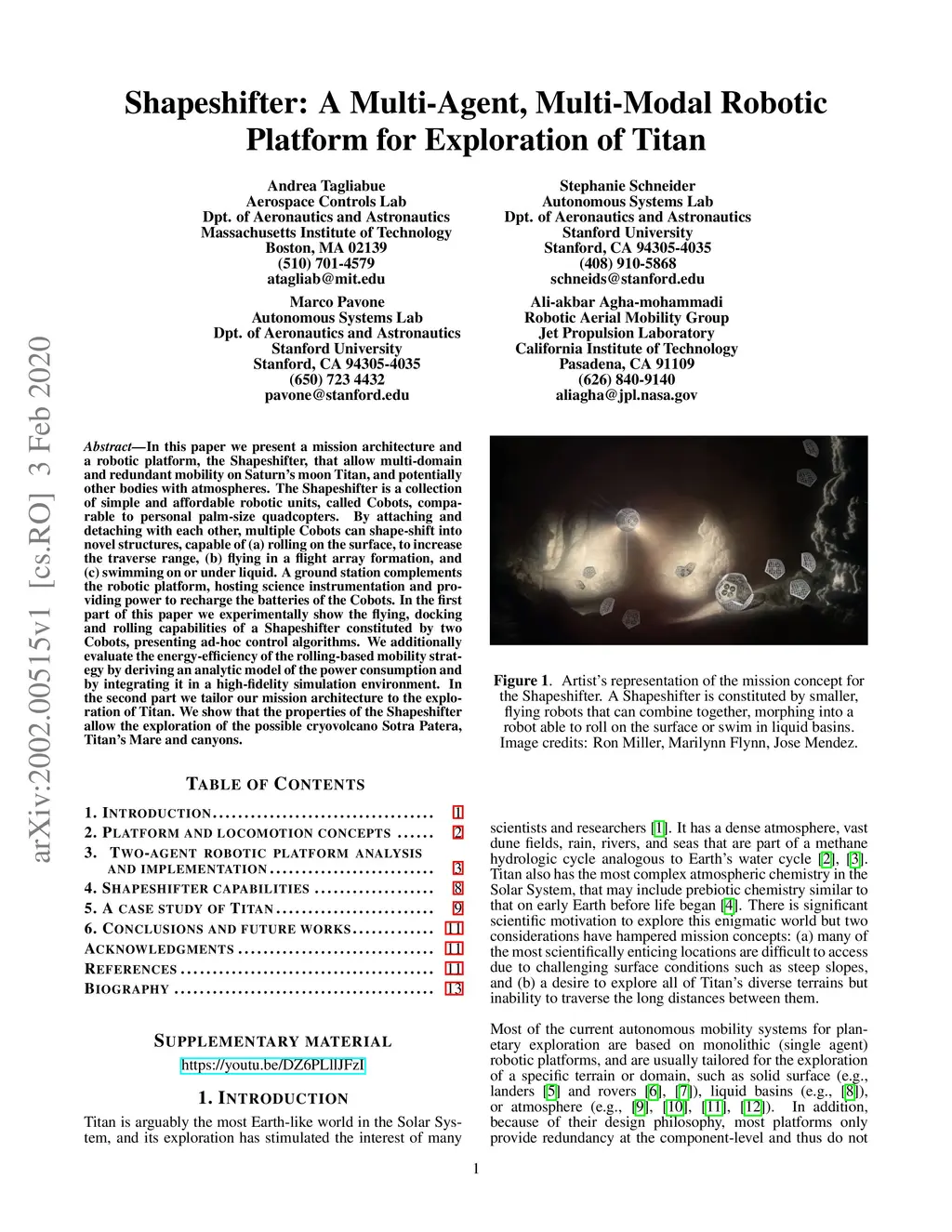 In this paper we present a mission architecture and a robotic platform, the Shapeshifter, that allow multi-domain and redundant mobility on Saturn's moon Titan, and potentially other bodies with atmospheres. The Shapeshifter is a collection of simple and affordable robotic units, called Cobots, comparable to personal palm-size quadcopters. By attaching and detaching with each other, multiple Cobots can shape-shift into novel structures, capable of (a) rolling on the surface, to increase the traverse range, (b) flying in a flight array formation, and (c) swimming on or under liquid. A ground station complements the robotic platform, hosting science instrumentation and providing power to recharge the batteries of the Cobots. In the first part of this paper we experimentally show the flying, docking and rolling capabilities of a Shapeshifter constituted by two Cobots, presenting ad-hoc control algorithms. We additionally evaluate the energy-efficiency of the rolling-based mobility strategy by deriving an analytic model of the power consumption and by integrating it in a high-fidelity simulation environment. In the second part we tailor our mission architecture to the exploration of Titan. We show that the properties of the Shapeshifter allow the exploration of the possible cryovolcano Sotra Patera, Titan's Mare and canyons.
