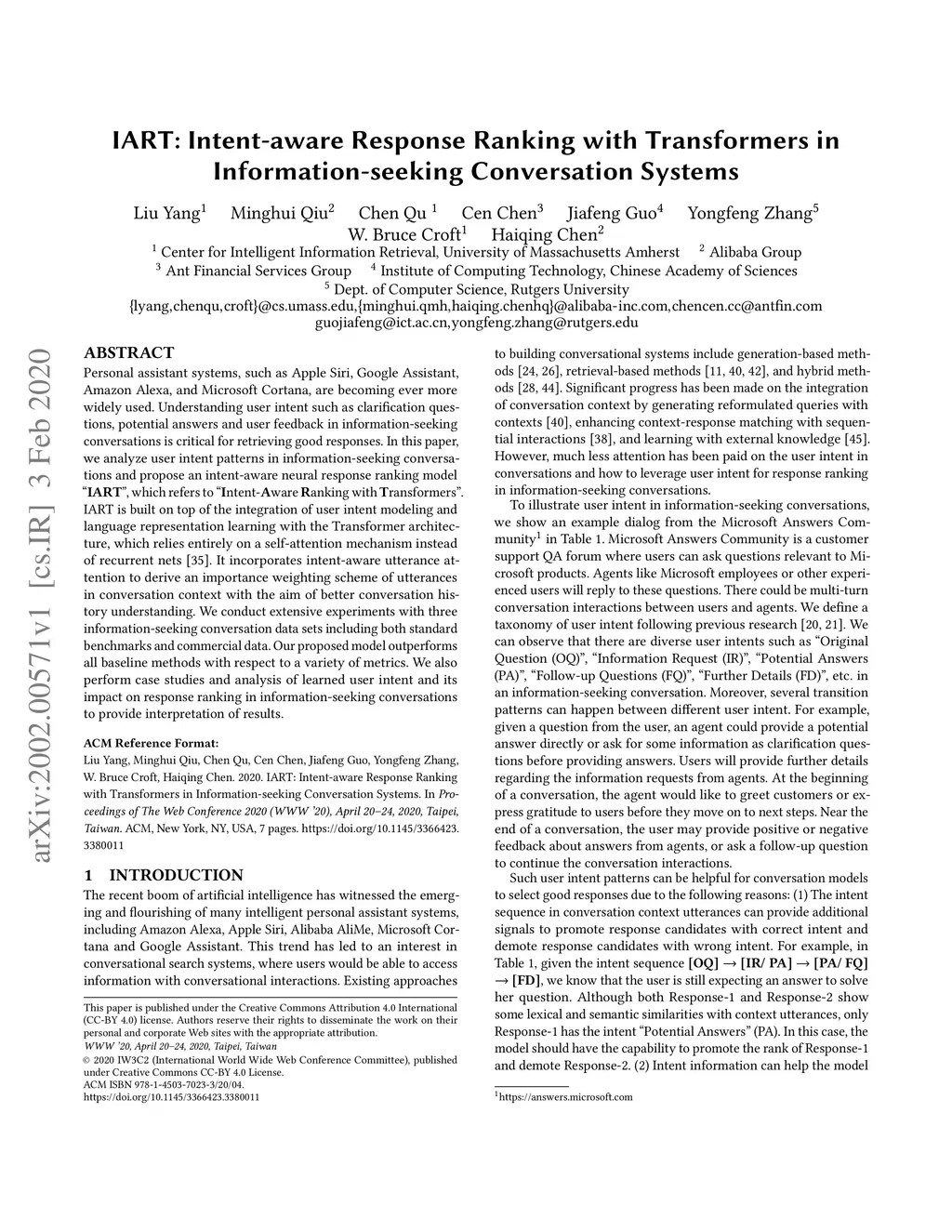 IART: Intent-aware Response Ranking with Transformers in