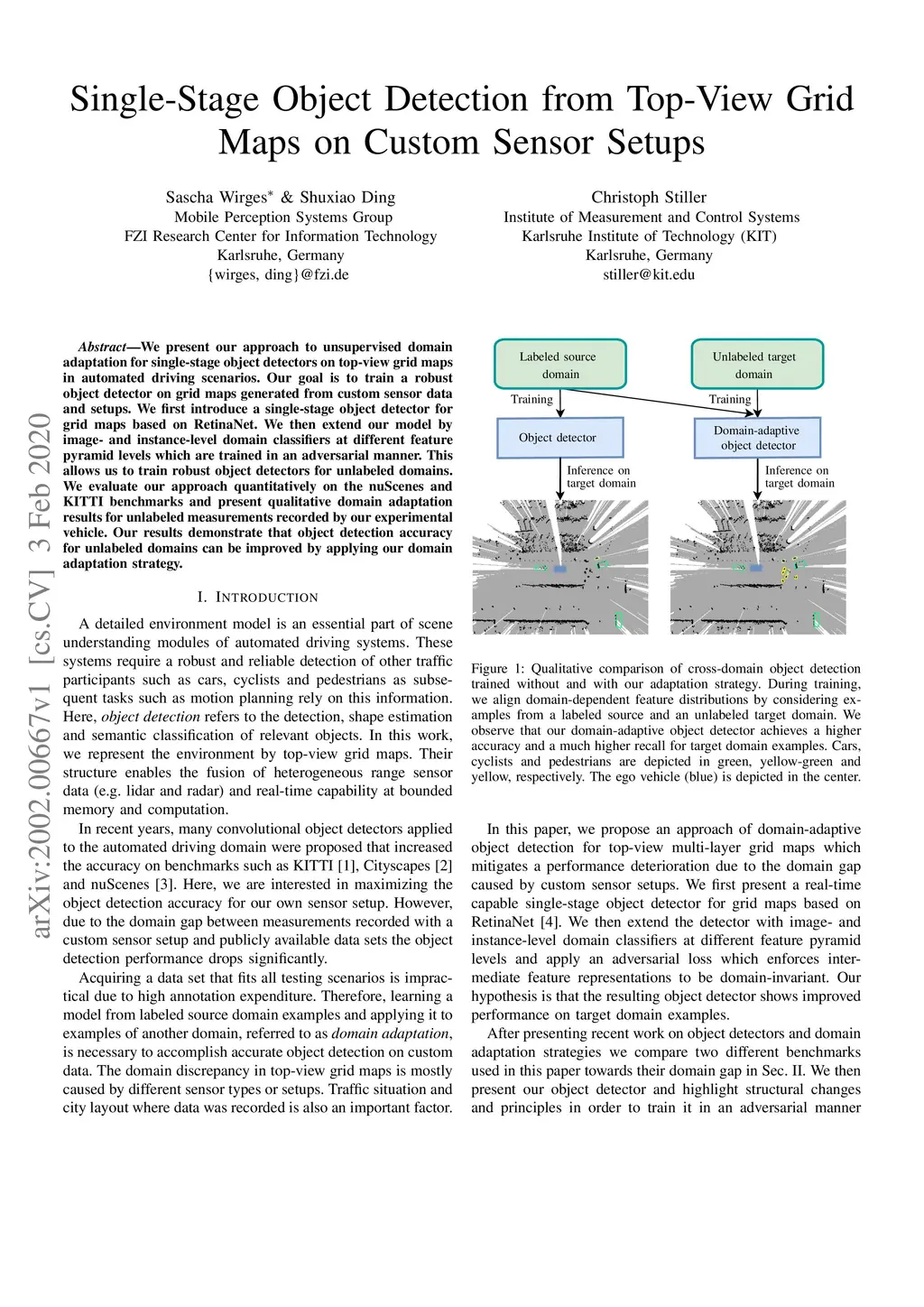 We present our approach to unsupervised domain adaptation for single-stage object detectors on top-view grid maps in automated driving scenarios. Our goal is to train a robust object detector on grid maps generated from custom sensor data and setups. We first introduce a single-stage object detector for grid maps based on RetinaNet. We then extend our model by image- and instance-level domain classifiers at different feature pyramid levels which are trained in an adversarial manner. This allows us to train robust object detectors for unlabeled domains. We evaluate our approach quantitatively on the nuScenes and KITTI benchmarks and present qualitative domain adaptation results for unlabeled measurements recorded by our experimental vehicle. Our results demonstrate that object detection accuracy for unlabeled domains can be improved by applying our domain adaptation strategy.