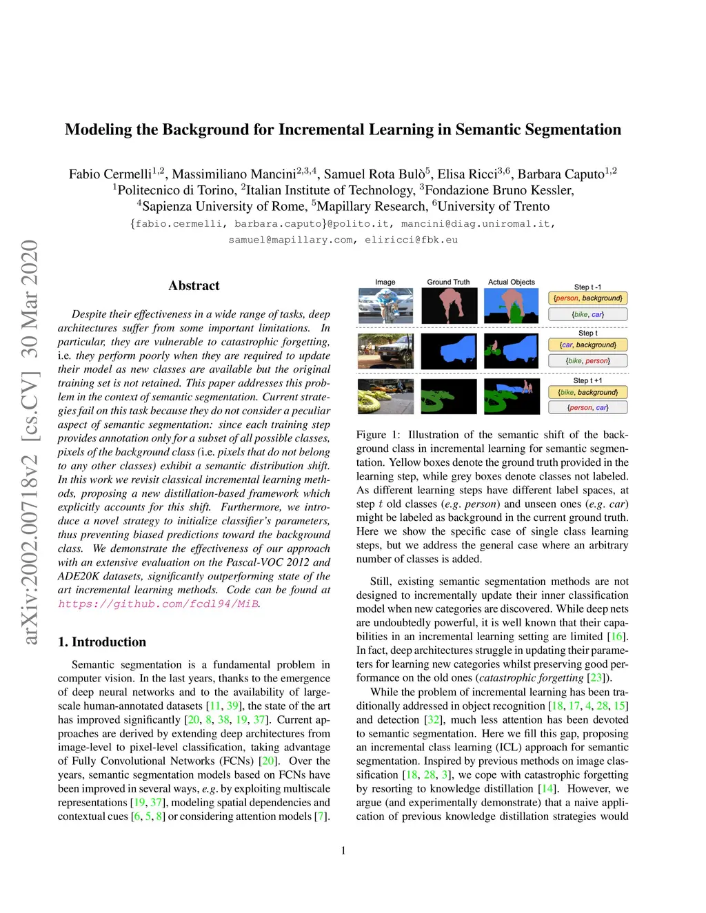 Despite their effectiveness in a wide range of tasks, deep architectures suffer from some important limitations. In particular, they are vulnerable to catastrophic forgetting, i.e. they perform poorly when they are required to update their model as new classes are available but the original training set is not retained. This paper addresses this problem in the context of semantic segmentation. Current strategies fail on this task because they do not consider a peculiar aspect of semantic segmentation: since each training step provides annotation only for a subset of all possible classes, pixels of the background class (i.e. pixels that do not belong to any other classes) exhibit a semantic distribution shift. In this work we revisit classical incremental learning methods, proposing a new distillation-based framework which explicitly accounts for this shift. Furthermore, we introduce a novel strategy to initialize classifier's parameters, thus preventing biased predictions toward the background class. We demonstrate the effectiveness of our approach with an extensive evaluation on the Pascal-VOC 2012 and ADE20K datasets, significantly outperforming state of the art incremental learning methods.