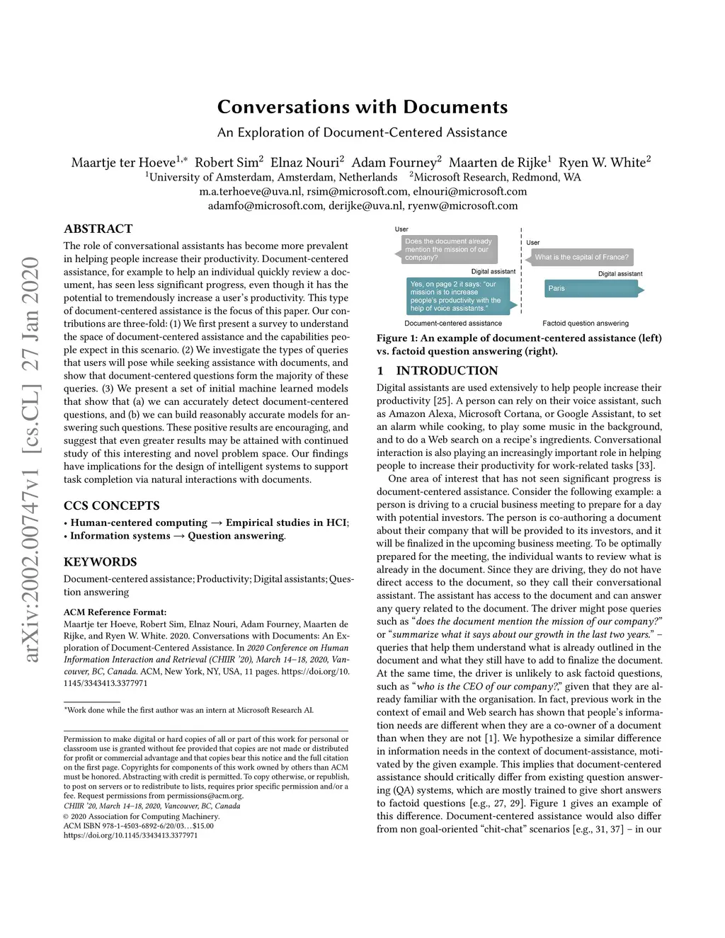 The role of conversational assistants has become more prevalent in helping people increase their productivity. Document-centered assistance, for example to help an individual quickly review a document, has seen less significant progress, even though it has the potential to tremendously increase a user's productivity. This type of document-centered assistance is the focus of this paper. Our contributions are three-fold: (1) We first present a survey to understand the space of document-centered assistance and the capabilities people expect in this scenario. (2) We investigate the types of queries that users will pose while seeking assistance with documents, and show that document-centered questions form the majority of these queries. (3) We present a set of initial machine learned models that show that (a) we can accurately detect document-centered questions, and (b) we can build reasonably accurate models for answering such questions. These positive results are encouraging, and suggest that even greater results may be attained with continued study of this interesting and novel problem space. Our findings have implications for the design of intelligent systems to support task completion via natural interactions with documents.