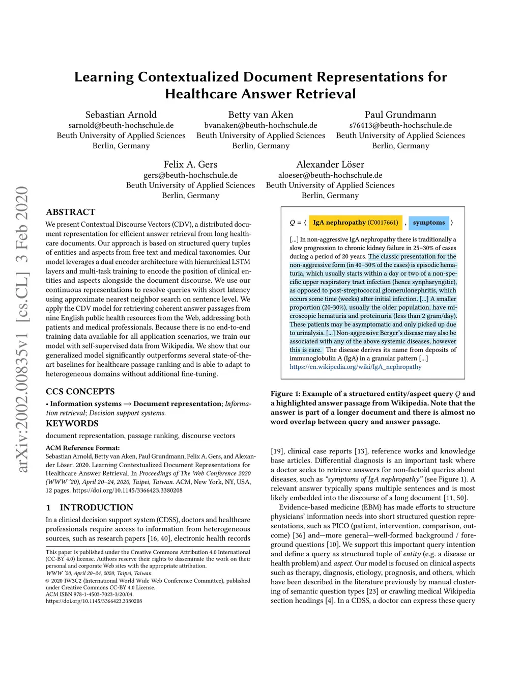 We present Contextual Discourse Vectors (CDV), a distributed document representation for efficient answer retrieval from long healthcare documents. Our approach is based on structured query tuples of entities and aspects from free text and medical taxonomies. Our model leverages a dual encoder architecture with hierarchical LSTM layers and multi-task training to encode the position of clinical entities and aspects alongside the document discourse. We use our continuous representations to resolve queries with short latency using approximate nearest neighbor search on sentence level. We apply the CDV model for retrieving coherent answer passages from nine English public health resources from the Web, addressing both patients and medical professionals. Because there is no end-to-end training data available for all application scenarios, we train our model with self-supervised data from Wikipedia. We show that our generalized model significantly outperforms several state-of-the-art baselines for healthcare passage ranking and is able to adapt to heterogeneous domains without additional fine-tuning.