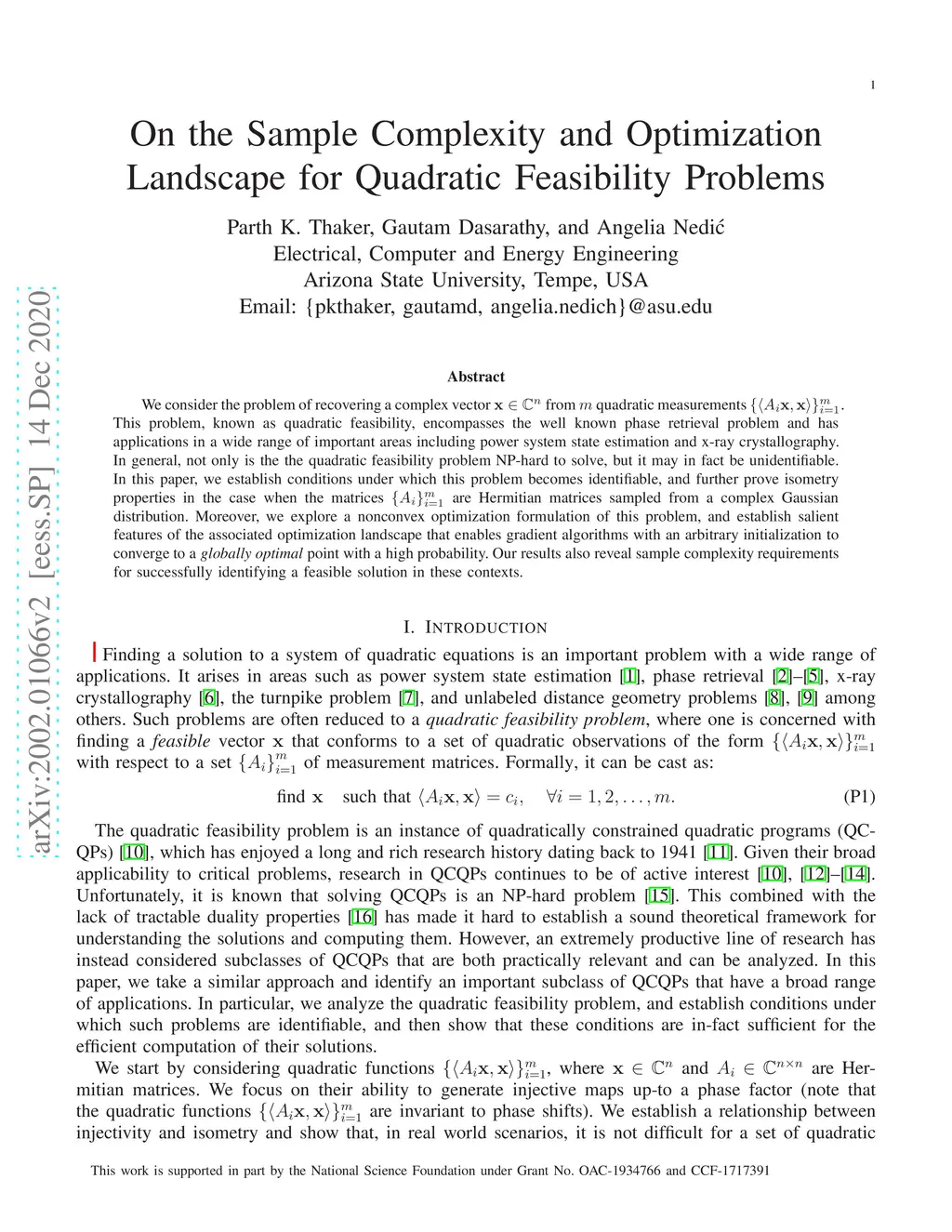 We consider the problem of recovering a complex vector from quadratic measurements . This problem, known as quadratic feasibility, encompasses the well known phase retrieval problem and has applications in a wide range of important areas including power system state estimation and x-ray crystallography. In general, not only is the the quadratic feasibility problem NP-hard to solve, but it may in fact be unidentifiable. In this paper, we establish conditions under which this problem becomes {identifiable}, and further prove isometry properties in the case when the matrices are Hermitian matrices sampled from a complex Gaussian distribution. Moreover, we explore a nonconvex {optimization} formulation of this problem, and establish salient features of the associated optimization landscape that enables gradient algorithms with an arbitrary initialization to converge to a \emph{globally optimal} point with a high probability. Our results also reveal sample complexity requirements for successfully identifying a feasible solution in these contexts.
