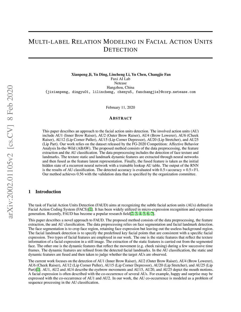 This paper describes an approach to the facial action units detections. The involved action units (AU) include AU1 (Inner Brow Raiser), AU2 (Outer Brow Raiser), AU4 (Brow Lowerer), AU6 (Cheek Raise), AU12 (Lip Corner Puller), AU15 (Lip Corner Depressor), AU20 (Lip Stretcher), and AU25 (Lip Part). Our work relies on the dataset released by the FG-2020 Competition: Affective Behavior Analysis In-the-Wild (ABAW). The proposed method consists of the data preprocessing, the feature extraction and the AU classification. The data preprocessing includes the detection of face texture and landmarks. The texture static and landmark dynamic features are extracted through neural networks and then fused as the feature latent representation. Finally, the fused feature is taken as the initial hidden state of a recurrent neural network with a trainable lookup AU table. The output of the RNN is the results of AU classification. The detected accuracy is evaluated with 0.5accuracy + 0.5F1. Our method achieve 0.56 with the validation data that is specified by the organization committee.