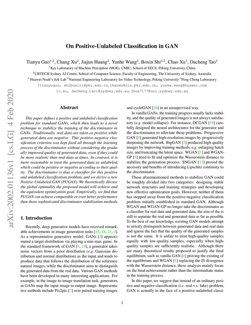 This paper defines a positive and unlabeled classification problem for standard GANs, which then leads to a novel technique to stabilize the training of the discriminator in GANs. Traditionally, real data are taken as positive while generated data are negative. This positive-negative classification criterion was kept fixed all through the learning process of the discriminator without considering the gradually improved quality of generated data, even if they could be more realistic than real data at times. In contrast, it is more reasonable to treat the generated data as unlabeled, which could be positive or negative according to their quality. The discriminator is thus a classifier for this positive and unlabeled classification problem, and we derive a new Positive-Unlabeled GAN (PUGAN). We theoretically discuss the global optimality the proposed model will achieve and the equivalent optimization goal. Empirically, we find that PUGAN can achieve comparable or even better performance than those sophisticated discriminator stabilization methods.