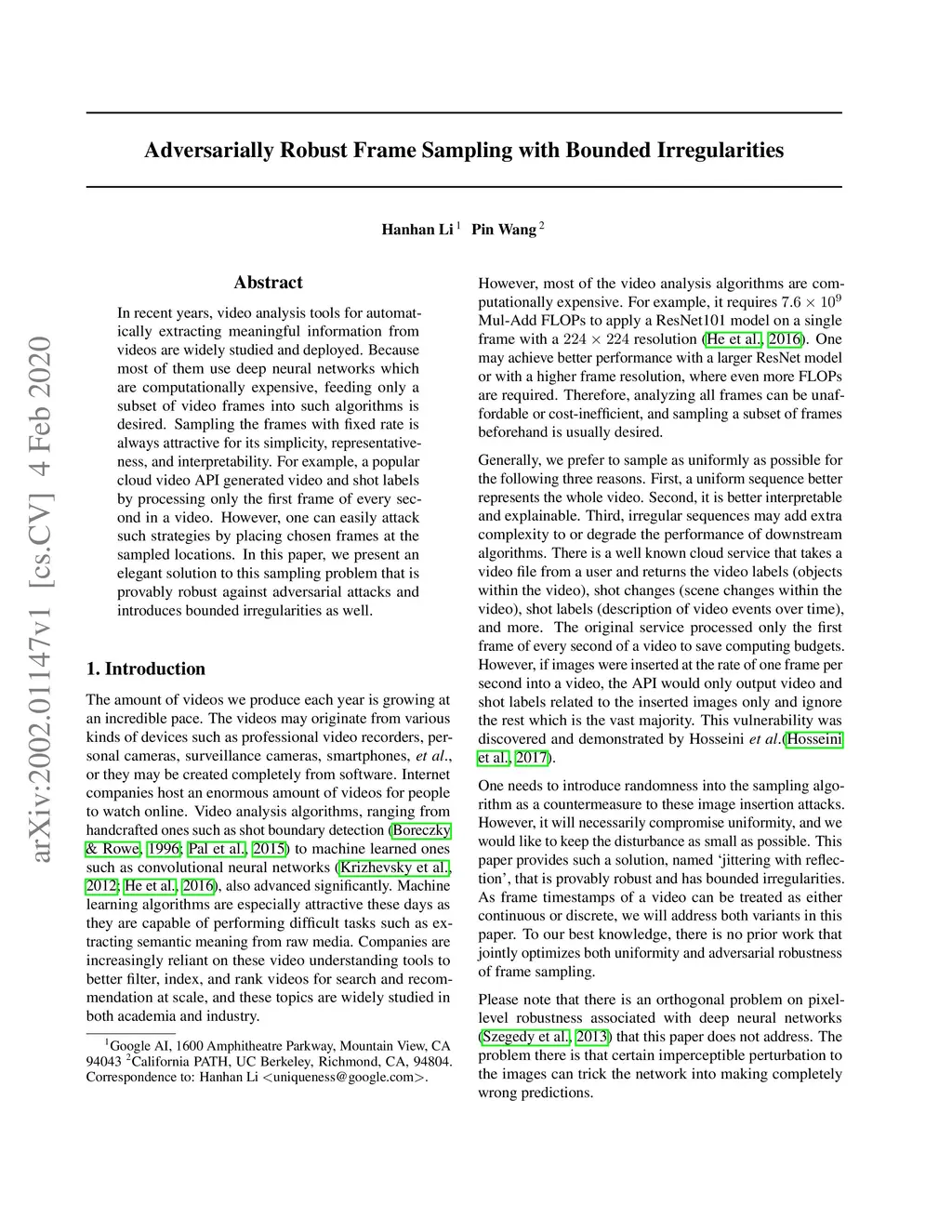 In recent years, video analysis tools for automatically extracting meaningful information from videos are widely studied and deployed. Because most of them use deep neural networks which are computationally expensive, feeding only a subset of video frames into such algorithms is desired. Sampling the frames with fixed rate is always attractive for its simplicity, representativeness, and interpretability. For example, a popular cloud video API generated video and shot labels by processing only the first frame of every second in a video. However, one can easily attack such strategies by placing chosen frames at the sampled locations. In this paper, we present an elegant solution to this sampling problem that is provably robust against adversarial attacks and introduces bounded irregularities as well.