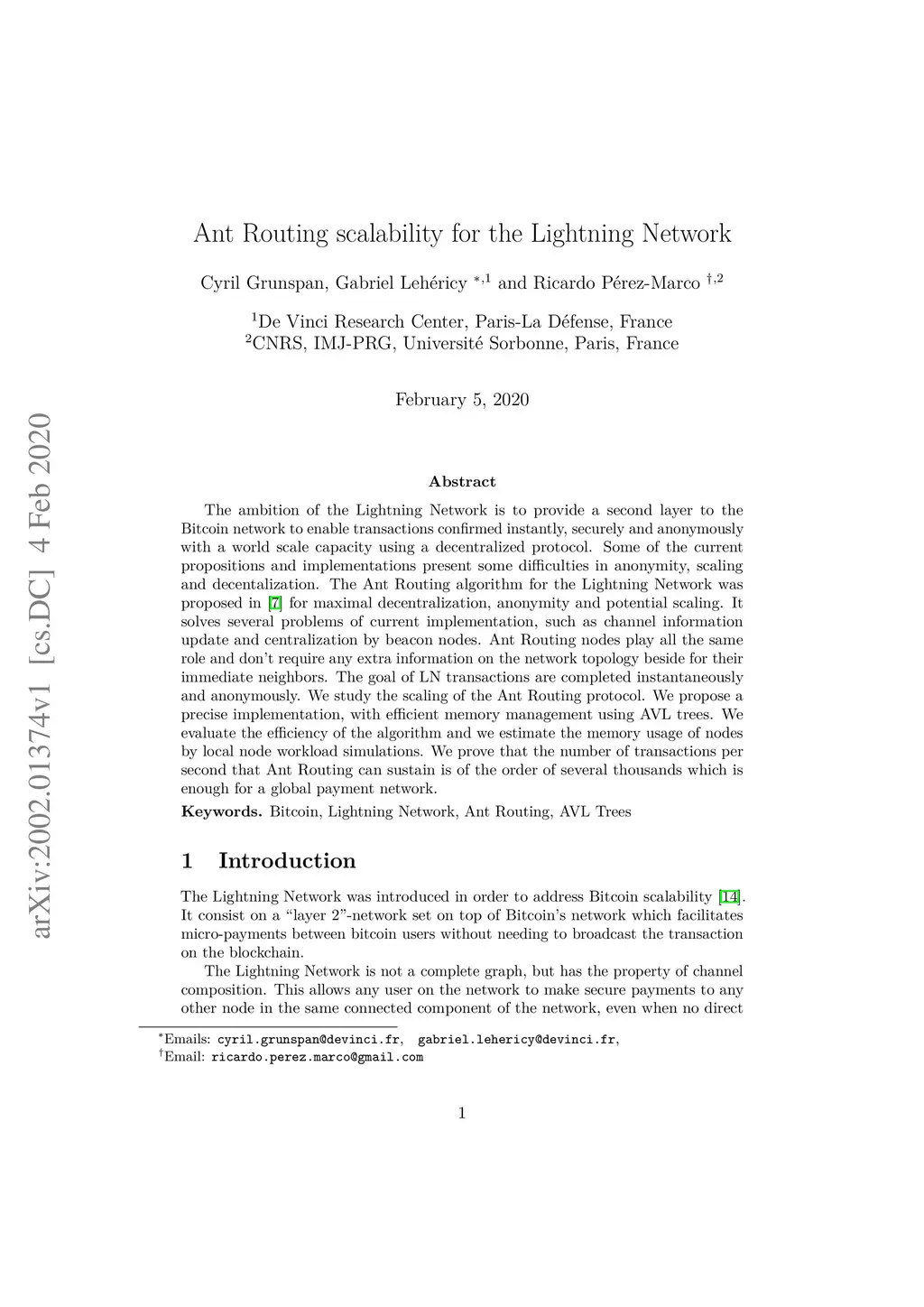 The ambition of the Lightning Network is to provide a second layer to the Bitcoin network to enable transactions confirmed instantly, securely and anonymously with a world scale capacity using a decentralized protocol. Some of the current propositions and implementations present some difficulties in anonymity, scaling and decentalization. The Ant Routing algorithm for the Lightning Network was proposed in \cite{GrunspanPerez} for maximal decentralization, anonymity and potential scaling. It solves several problems of current implementation, such as channel information update and centralization by beacon nodes. Ant Routing nodes play all the same role and don't require any extra information on the network topology beside for their immediate neighbors. The goal of LN transactions are completed instantaneously and anonymously. We study the scaling of the Ant Routing protocol. We propose a precise implementation, with efficient memory management using AVL trees. We evaluate the efficiency of the algorithm and we estimate the memory usage of nodes by local node workload simulations. We prove that the number of transactions per second that Ant Routing can sustain is of the order of several thousands which is enough for a global payment network.