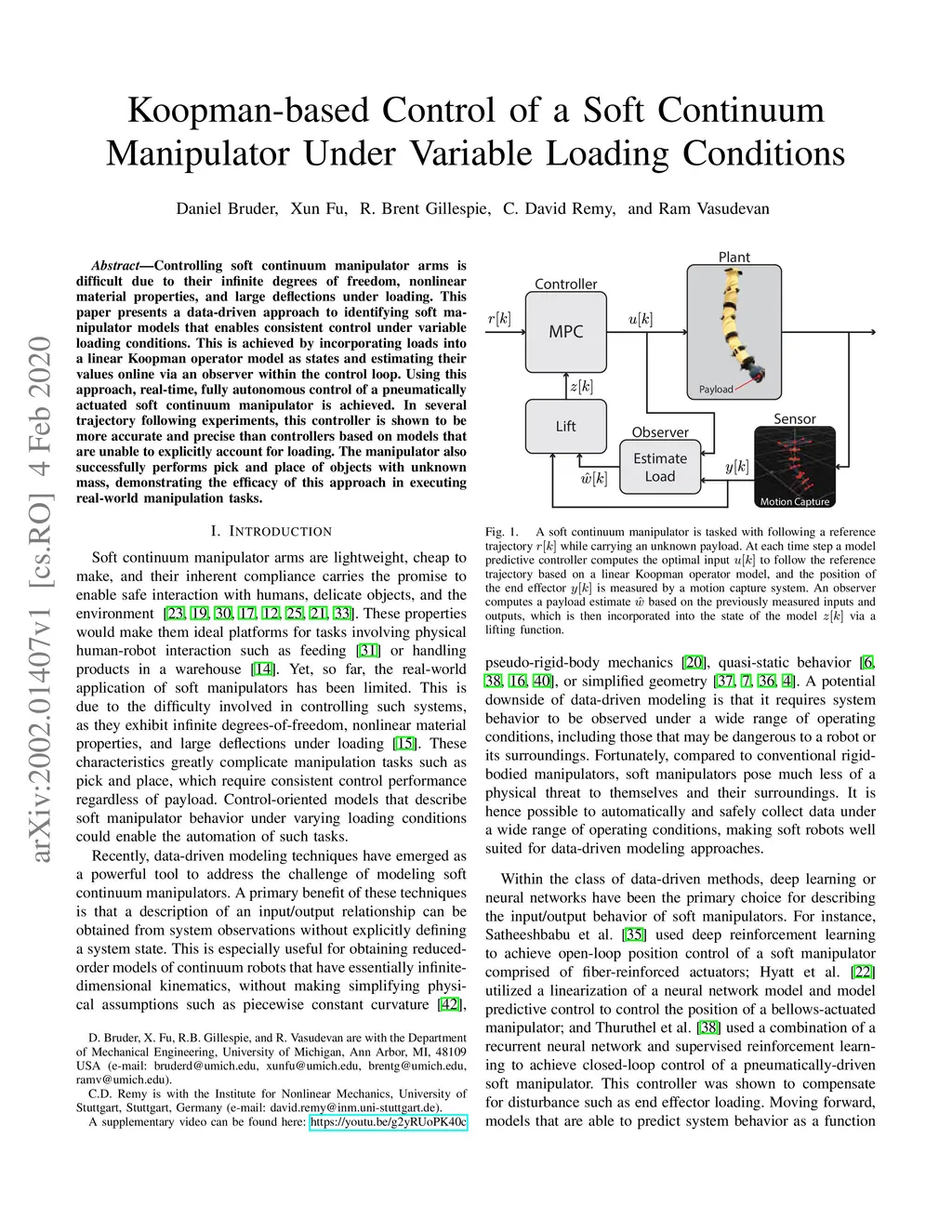 Controlling soft continuum manipulator arms is difficult due to their infinite degrees of freedom, nonlinear material properties, and large deflections under loading. This paper presents a data-driven approach to identifying soft manipulator models that enables consistent control under variable loading conditions. This is achieved by incorporating loads into a linear Koopman operator model as states and estimating their values online via an observer within the control loop. Using this approach, real-time, fully autonomous control of a pneumatically actuated soft continuum manipulator is achieved. In several trajectory following experiments, this controller is shown to be more accurate and precise than controllers based on models that are unable to explicitly account for loading. The manipulator also successfully performs pick and place of objects with unknown mass, demonstrating the efficacy of this approach in executing real-world manipulation tasks.