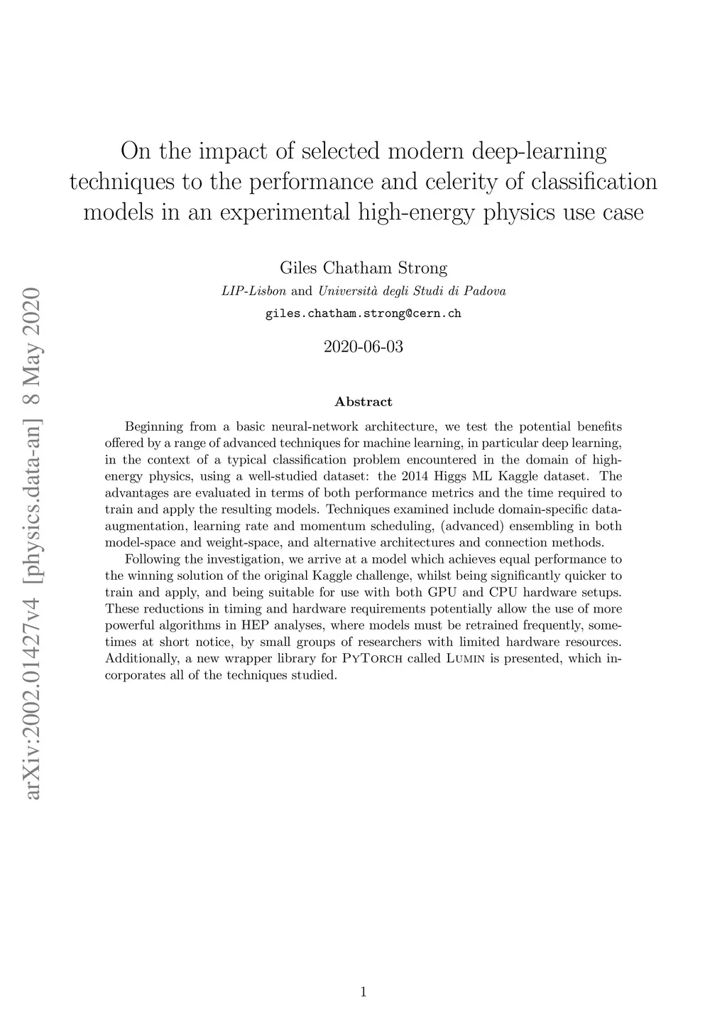 Beginning from a basic neural-network architecture, we test the potential benefits offered by a range of advanced techniques for machine learning, in particular deep learning, in the context of a typical classification problem encountered in the domain of high-energy physics, using a well-studied dataset: the 2014 Higgs ML Kaggle dataset. The advantages are evaluated in terms of both performance metrics and the time required to train and apply the resulting models. Techniques examined include domain-specific data-augmentation, learning rate and momentum scheduling, (advanced) ensembling in both model-space and weight-space, and alternative architectures and connection methods. Following the investigation, we arrive at a model which achieves equal performance to the winning solution of the original Kaggle challenge, whilst being significantly quicker to train and apply, and being suitable for use with both GPU and CPU hardware setups. These reductions in timing and hardware requirements potentially allow the use of more powerful algorithms in HEP analyses, where models must be retrained frequently, sometimes at short notice, by small groups of researchers with limited hardware resources. Additionally, a new wrapper library for PyTorch called LUMIN is presented, which incorporates all of the techniques studied.
