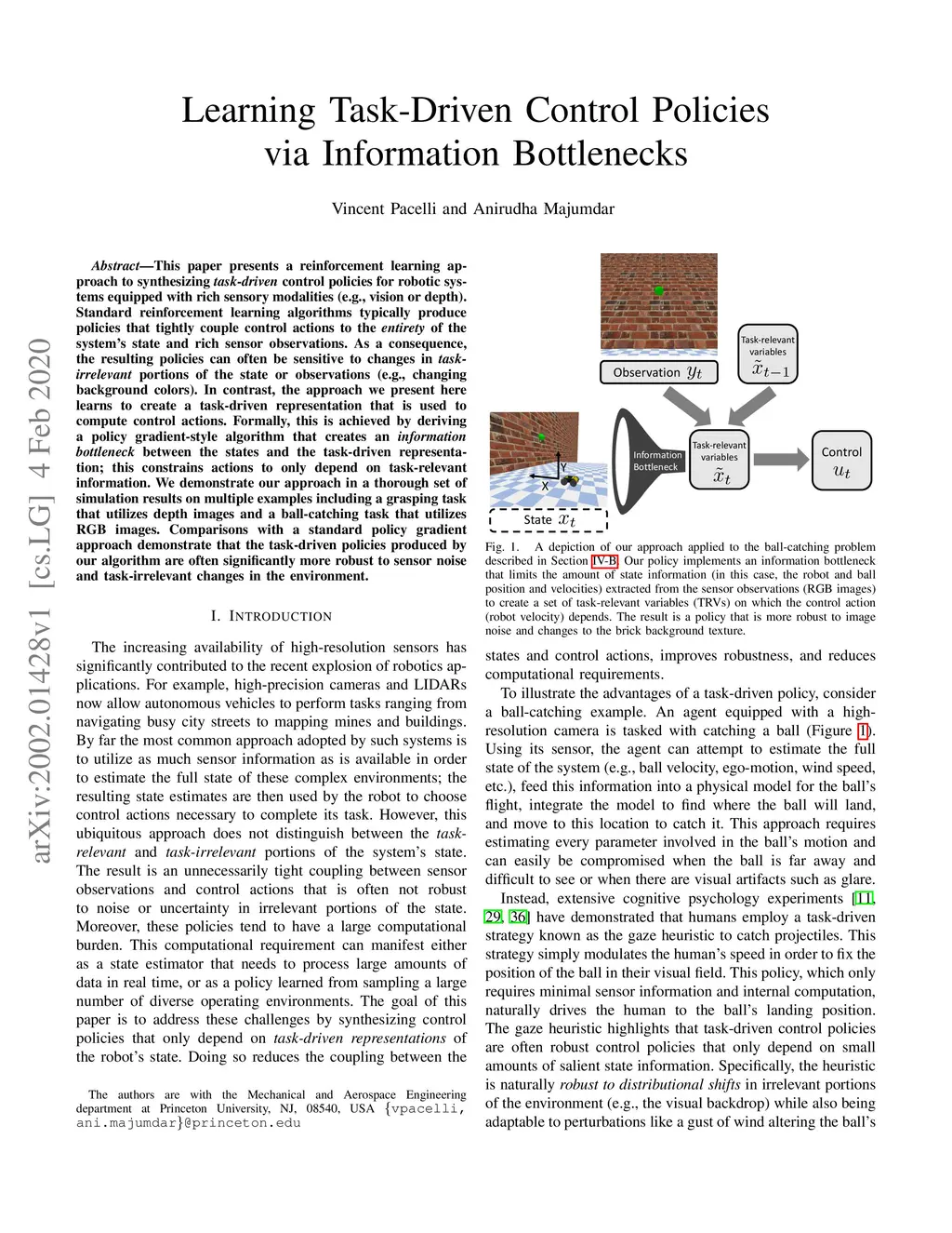Learning Task-Driven Control Policies via Information Bottlenecks