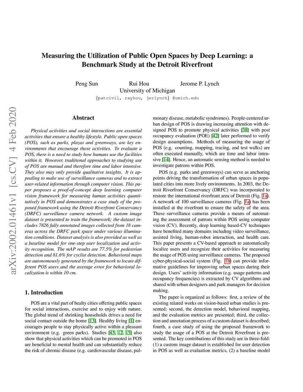 Physical activities and social interactions are essential activities that ensure a healthy lifestyle. Public open spaces (POS), such as parks, plazas and greenways, are key environments that encourage those activities. To evaluate a POS, there is a need to study how humans use the facilities within it. However, traditional approaches to studying use of POS are manual and therefore time and labor intensive. They also may only provide qualitative insights. It is appealing to make use of surveillance cameras and to extract user-related information through computer vision. This paper proposes a proof-of-concept deep learning computer vision framework for measuring human activities quantitatively in POS and demonstrates a case study of the proposed framework using the Detroit Riverfront Conservancy (DRFC) surveillance camera network. A custom image dataset is presented to train the framework; the dataset includes 7826 fully annotated images collected from 18 cameras across the DRFC park space under various illumination conditions. Dataset analysis is also provided as well as a baseline model for one-step user localization and activity recognition. The mAP results are 77.5\% for {\it pedestrian} detection and 81.6\% for {\it cyclist} detection. Behavioral maps are autonomously generated by the framework to locate different POS users and the average error for behavioral localization is within 10 cm.