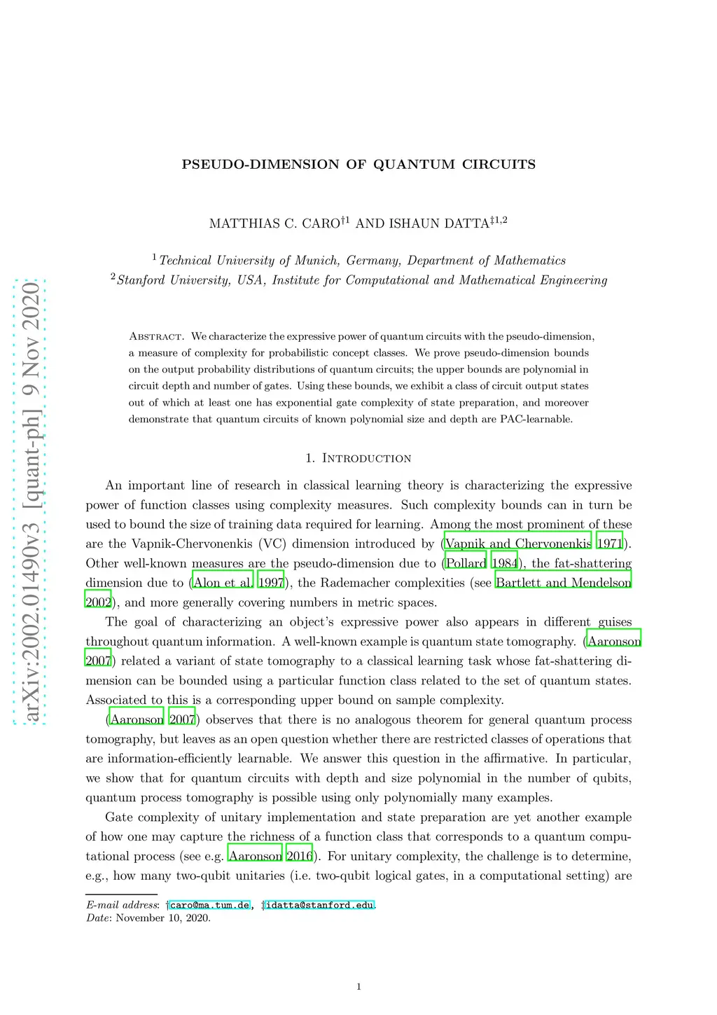 We characterize the expressive power of quantum circuits with the pseudo-dimension, a measure of complexity for probabilistic concept classes. We prove pseudo-dimension bounds on the output probability distributions of quantum circuits; the upper bounds are polynomial in circuit depth and number of gates. Using these bounds, we exhibit a class of circuit output states out of which at least one has exponential state complexity, and moreover demonstrate that quantum circuits of known polynomial size and depth are PAC-learnable.